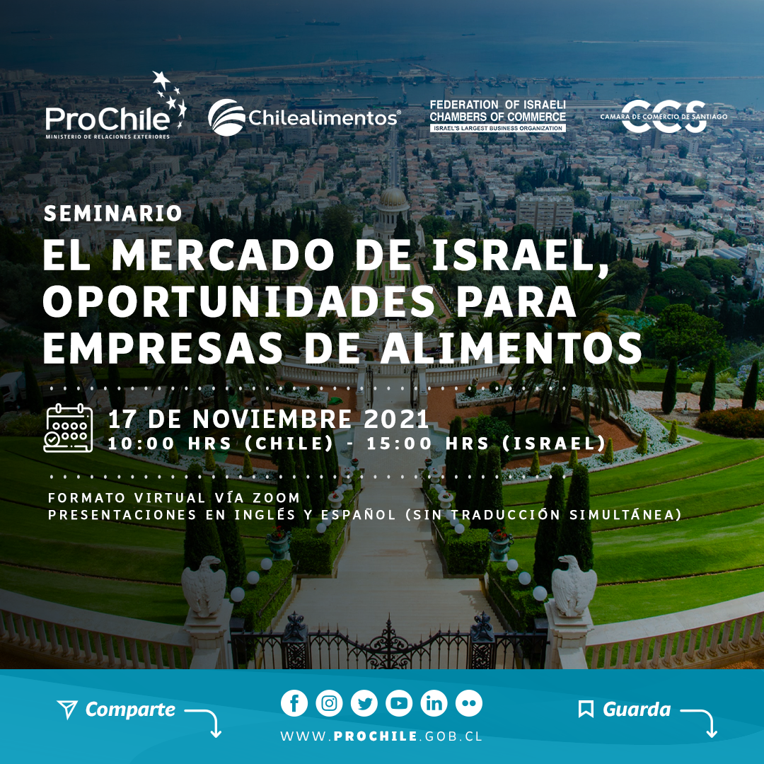 El 17 de noviembre, se realizó el Webinar titulado "El Mercado de Israel, oportunidades para empresas de alimentos", organizado por la Federación de Cámaras de Comercio de Israel (FICC), la Cámara de Comercio de Santiago y esta embajada en conjunto con ProChile, dirigido a empresarios y exportadores interesados en conocer el mercado israelí y regulaciones para ingresar a él.