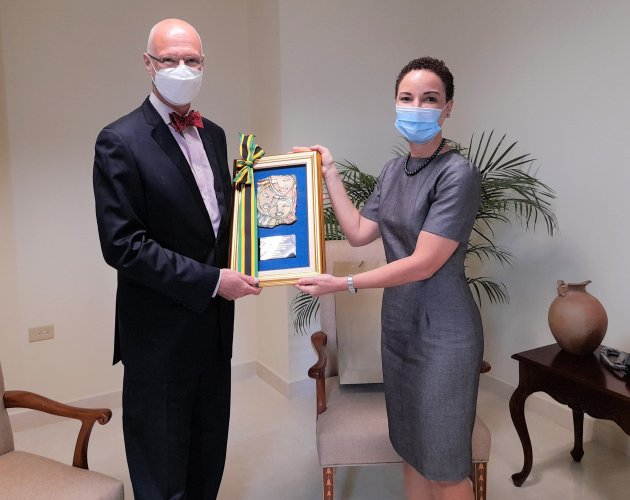 Embajador Francisco Bernales realiza visita de despedida a la Ministra Kamina Johnson Smith