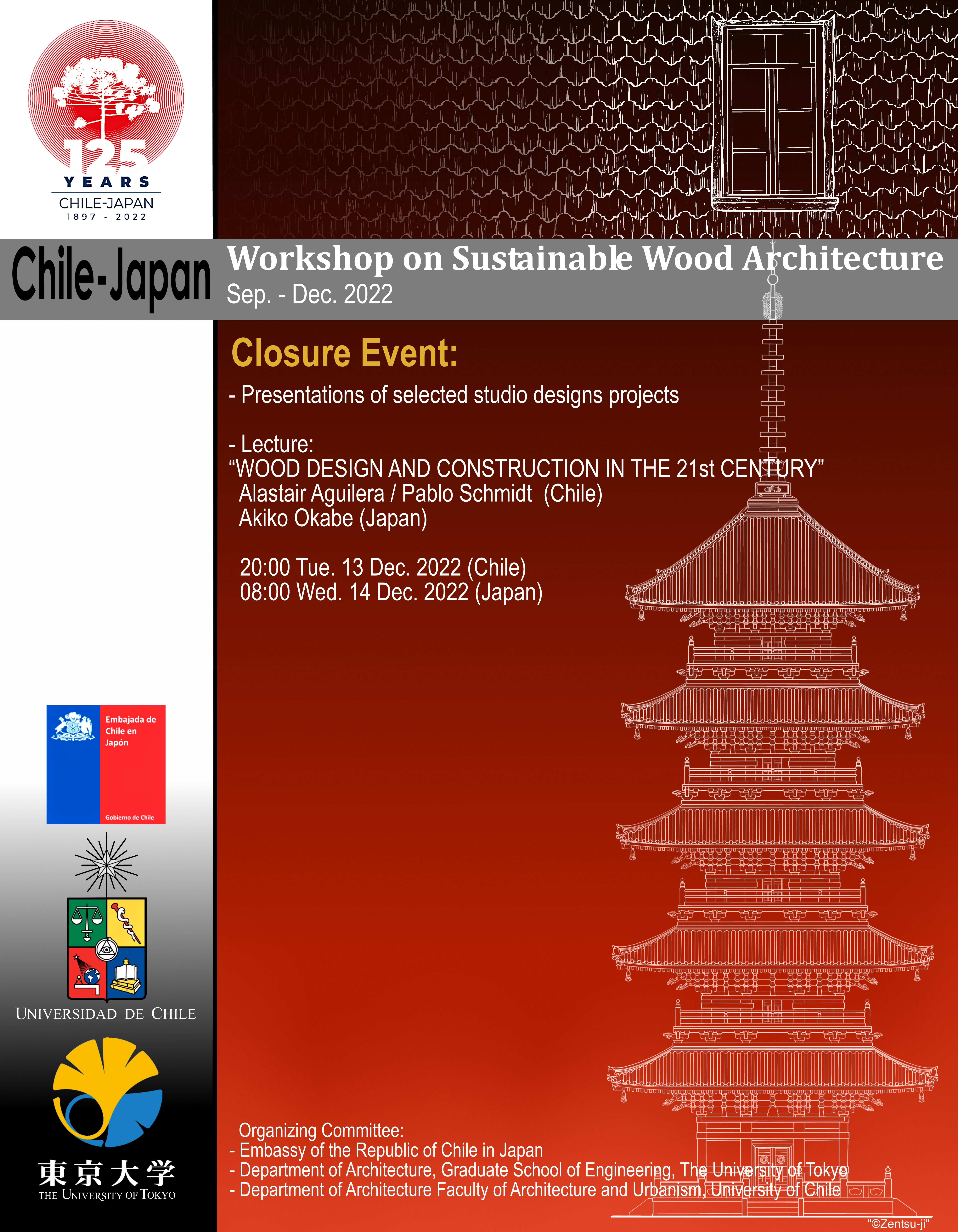 Universidad de Tokio, titulada: “Chile-Japan Workshop on Sustainable Wood Architecture”. Esta iniciativa académica-cultural fue organizada entre esta Embajada y las dos Casas de Estudio y estuvo circunscrita a la conmemoración de los 125 años de relaciones diplomáticas entre Chile y Japón.