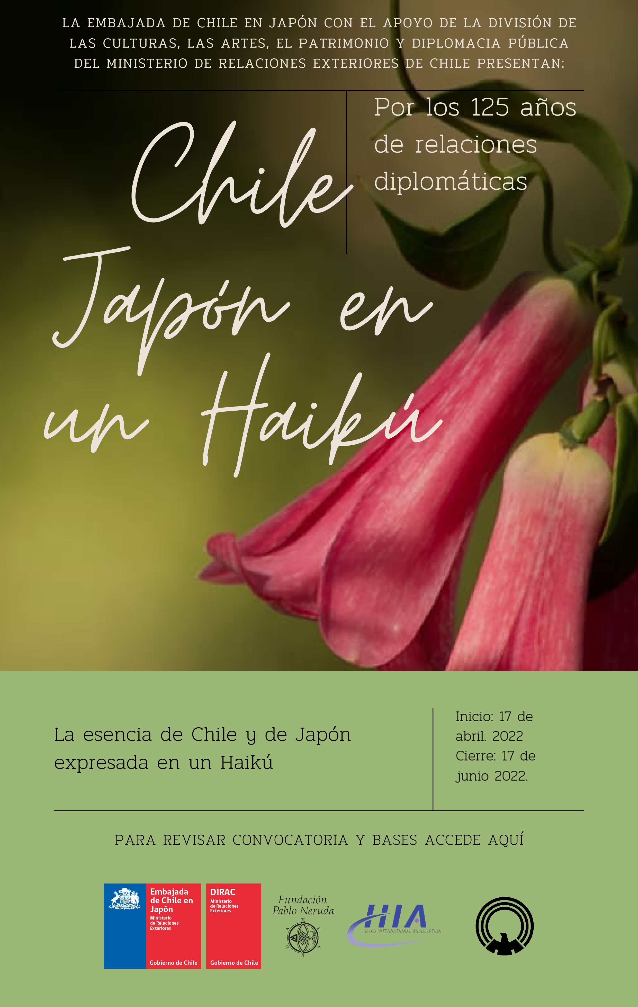 En conmemoración de los 125 años de relaciones diplomáticas, la Embajada de Chile en Japón, con el apoyo de la División de las Culturas, las Artes, el Patrimonio y Diplomacia Pública del Ministerio de Relaciones Exteriores de Chile (DIRAC), y la Municipalidad de Mitaka, Host Town de Chile de los juegos paralímpicos de Tokyo 2020 en Japón, convocan al Concurso de Haikú 2022.