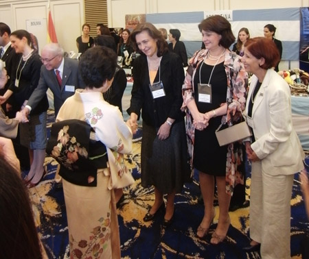 La sra. Cecilia Diez, esposa del Embajador Patricio Torres y organizadora de la participación chilena en el bazar, saluda a Su Alteza Imperial Princesa Hitachi, Presidenta Honoraria de la Asociación de Dama Nipo-Latinoamericanas y del Caribe que coordina anualmente esta actividad.