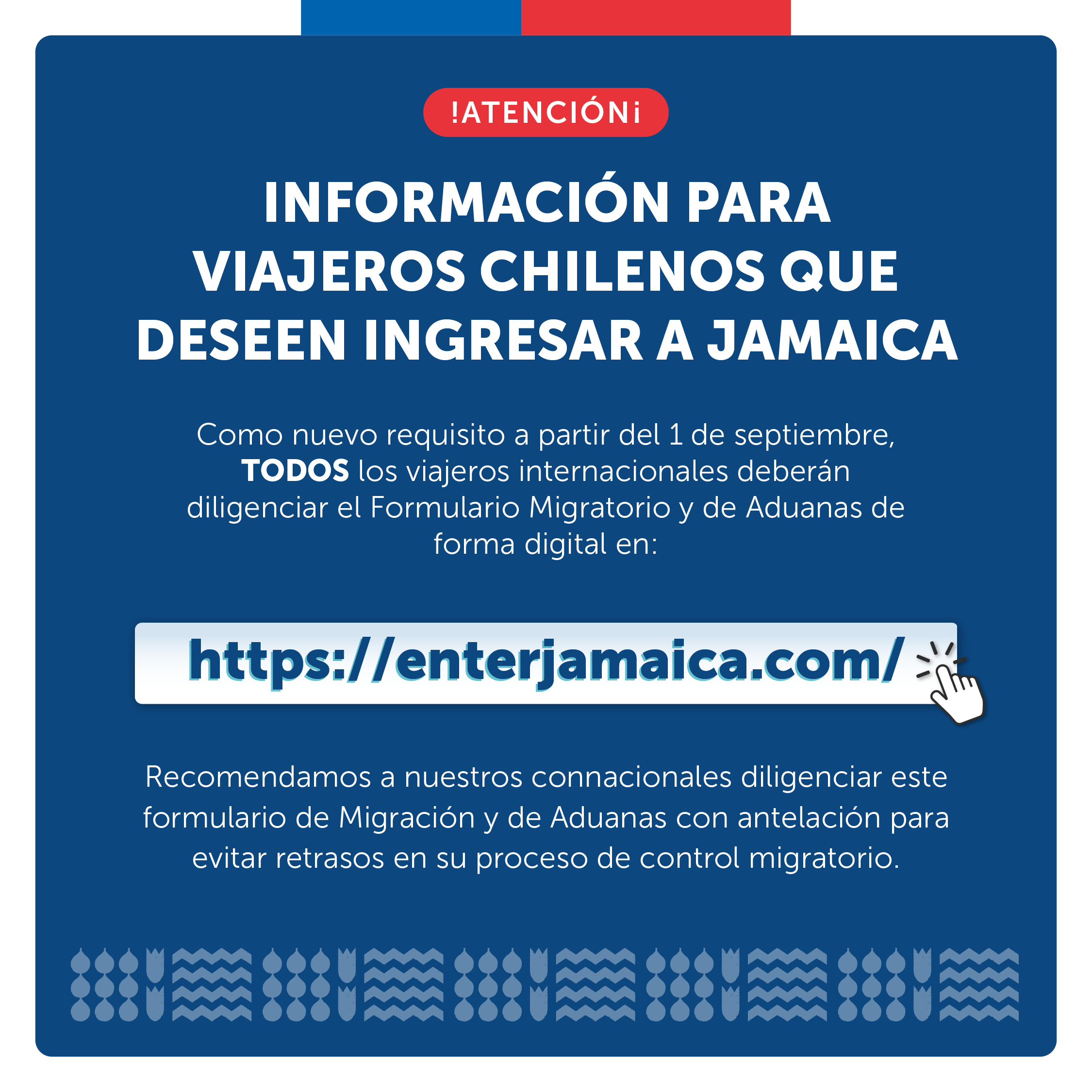 La Sección Consular de Chile en Kingston informa que, a partir del 1 de septiembre de 2023, todo viajero que ingrese a Jamaica deberá completar en línea el Formulario de Inmigración y Aduanas (Immigration/Customs Declaration (C5)) antes de su viaje a la isla y/o de ingresar al área de control de pasaportes de los aeropuertos internacionales de Kingston y Montego Bay.