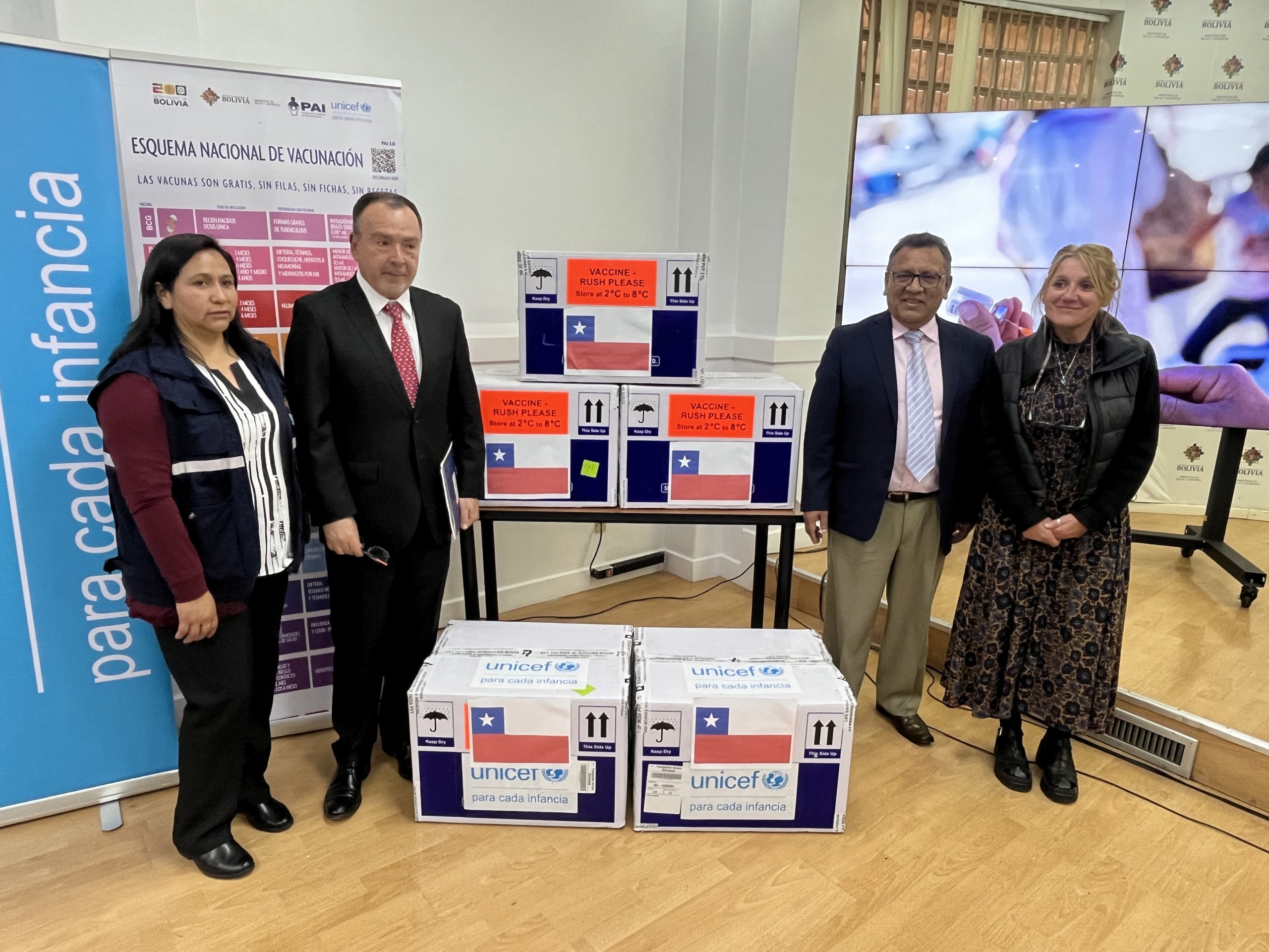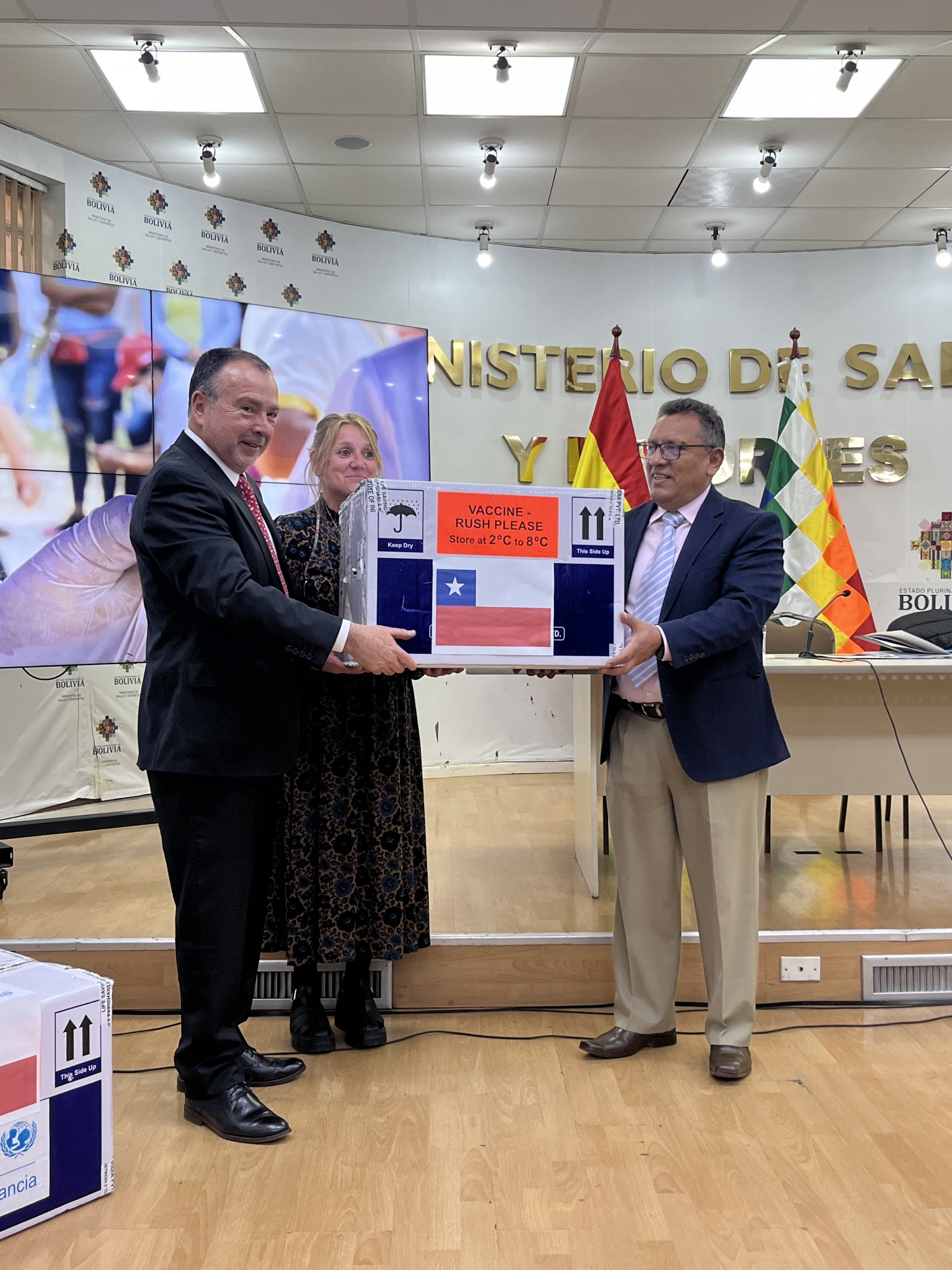 Esta donación de vacunas se realizó gracias al financiamiento del Fondo Chile y fue gestionado a través de la Agencia Chilena de Cooperación Internacional para el Desarrollo (AGCID), el PNUD Chile y UNICEF Bolivia.