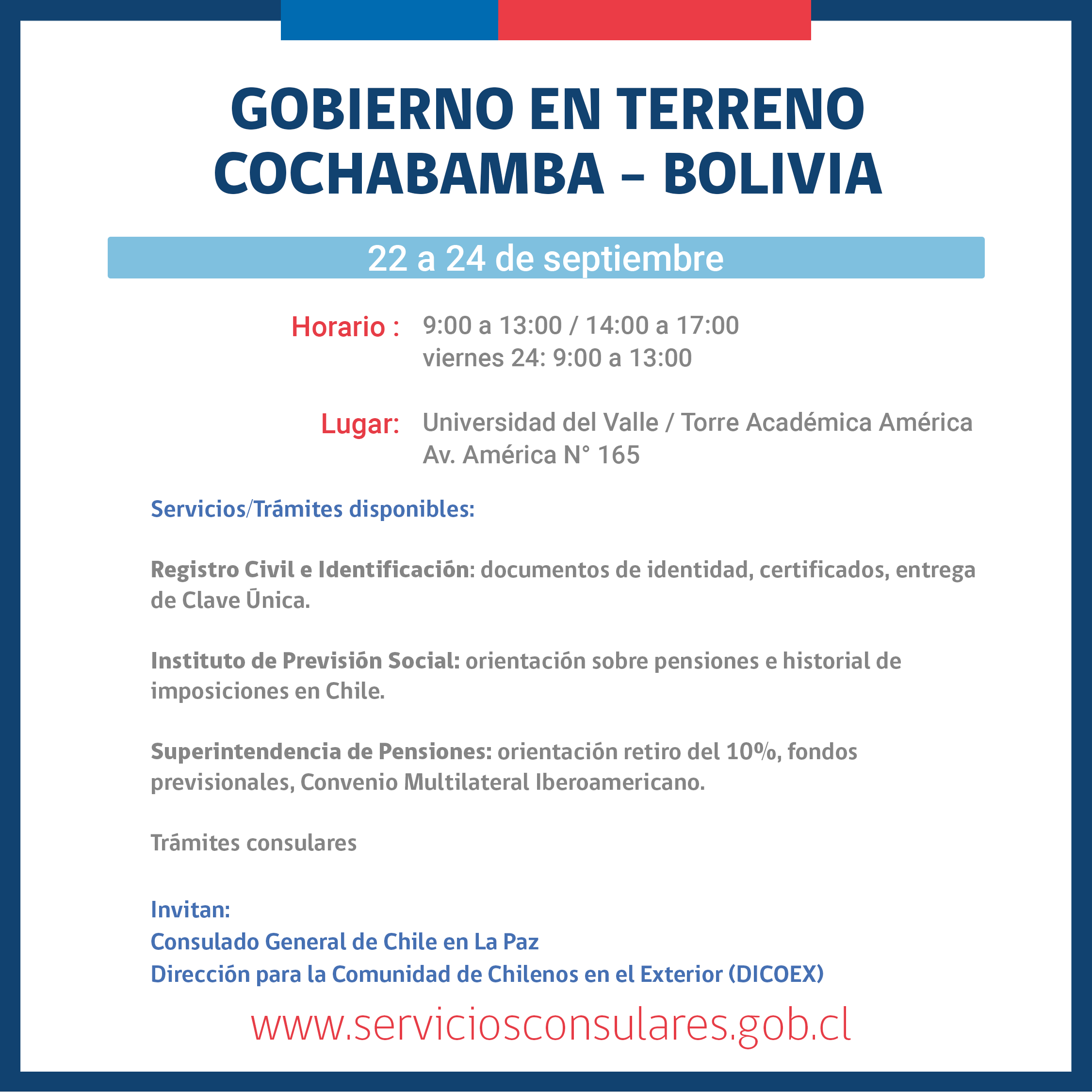 Acercar los Servicios Públicos a chilenos residentes en Cochabamba, Bolivia, es el objetivo de la actividad Gobierno en Terreno, organizada por la Dirección para la Comunidad de Chilenos en el Exterior (Dicoex) del Ministerio de Relaciones Exteriores y el Consulado General de Chile en La Paz.