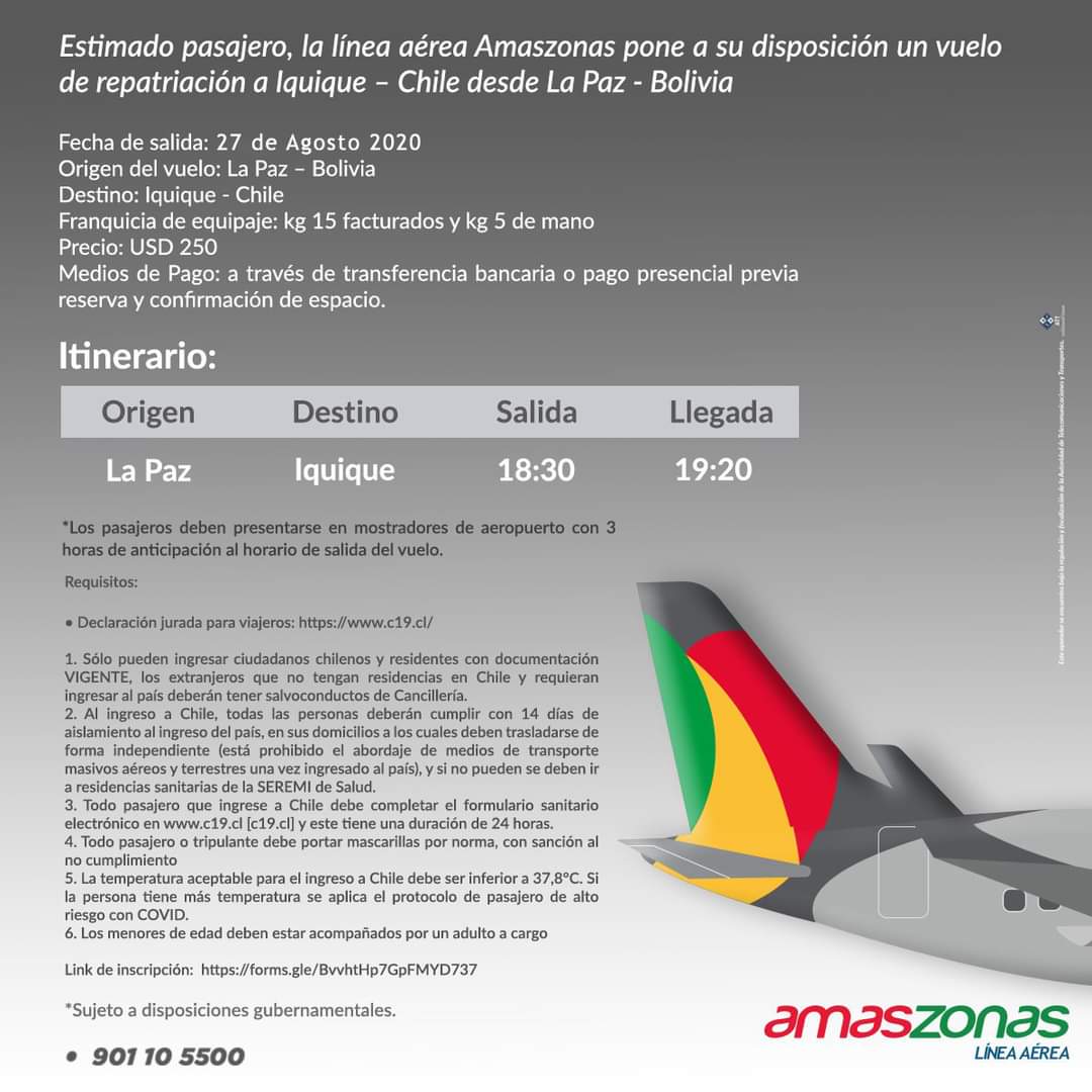 Informamos a la comunidad que el jueves 27 de agosto saldrá el vuelo de la línea aérea Amaszonas desde La Paz hacia Iquique.