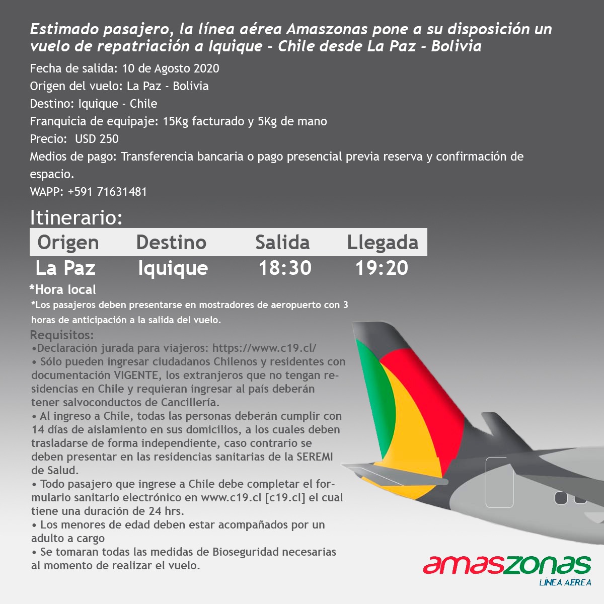 Informamos a la comunidad que quienes estén interesados en regresar a Chile, pueden optar al vuelo de la línea aérea Amaszonas. El avión saldrá el lunes 10 de agosto desde La Paz hacia Iquique.