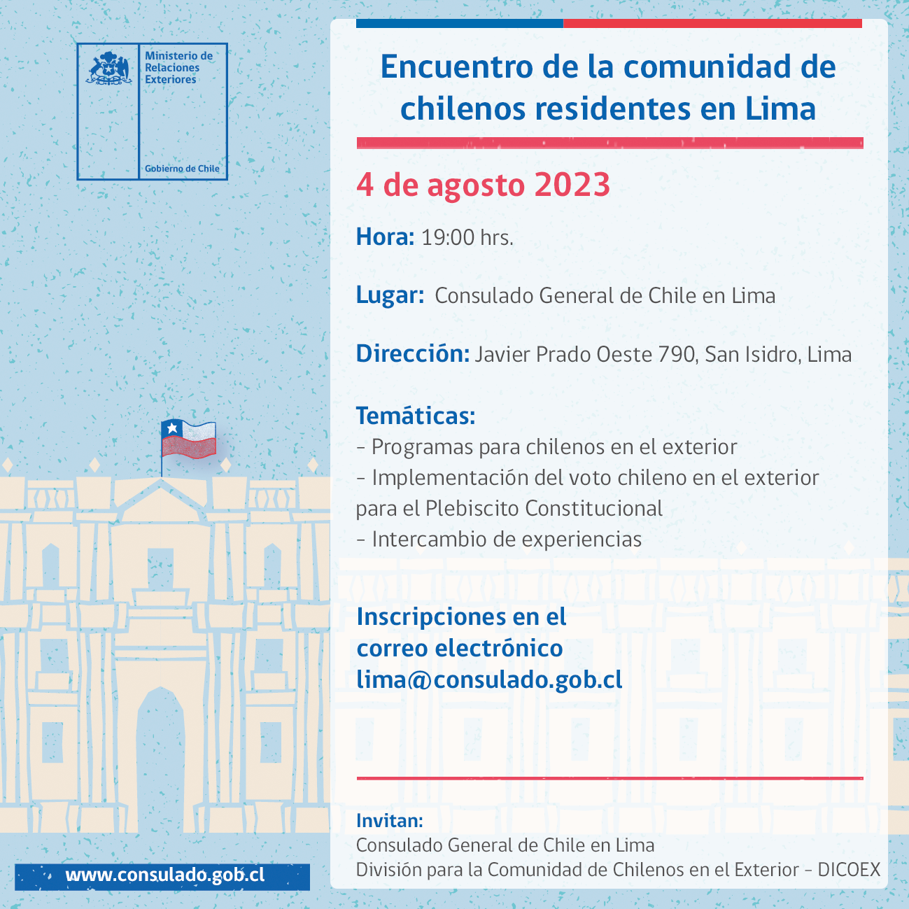 Este viernes 04 de agosto de 2023 se va a realizar un encuentro de chilenas y chilenos con la participación del embajador de Chile en Perú, Óscar Fuentes, el jefe de Dicoex, Fernando Salas y el cónsul en Lima, José Luis Briceño.