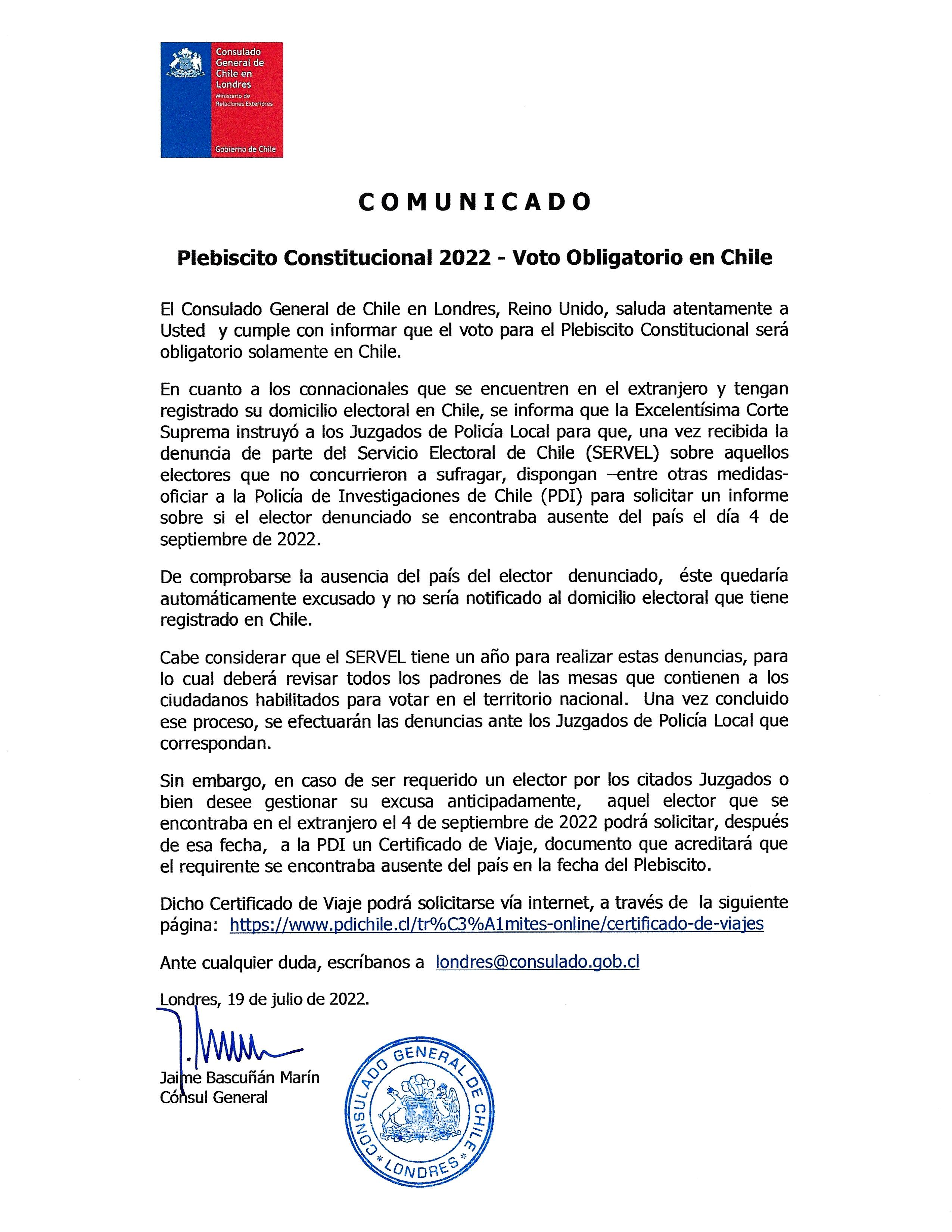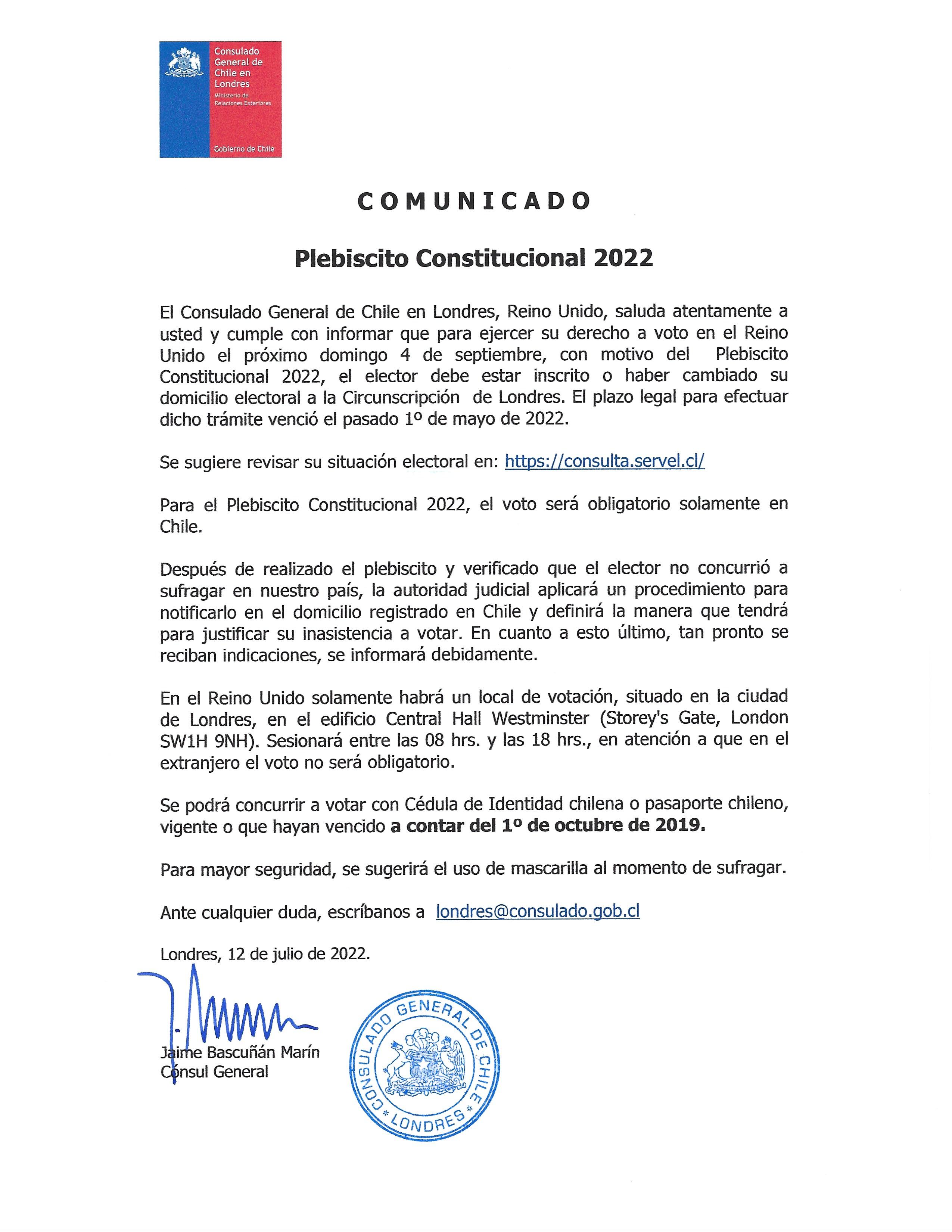 ¿Es usted chileno/a residiendo en el exterior? Revise sus datos electorales para este Plebiscito Constitucional, de domingo 4 de septiembre de 2022 (local de votación, número de mesa de sufragio y si fue designado/a vocal de mesa) en el siguiente enlace: http://consulta.servel.cl
