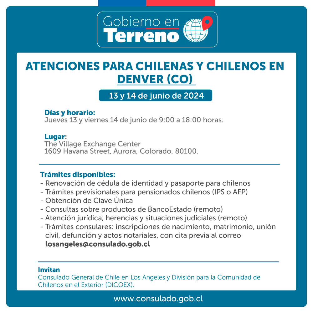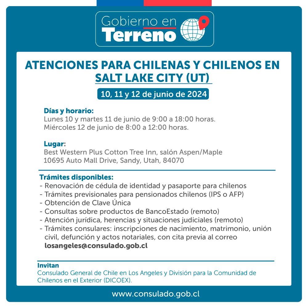 En un esfuerzo coordinado entre el Ministerio de Relaciones Exteriores, el Consulado General de Chile en Los Ángeles y distintas instituciones públicas chilenas, se ofrecerán servicios consulares descentralizados, en la modalidad denominada “Gobierno en Terreno”, en Salt Lake City, Utah (lunes 10, martes 11 y miércoles 12 de junio de 2024), y Denver, Colorado (jueves 13 y viernes 14 de junio de 2024).