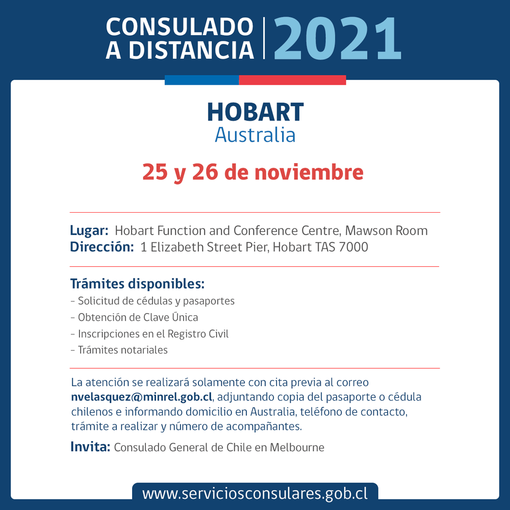 Los días 25 y 26 de noviembre, el Consulado General de Chile en Melbourne realizará un consulado a distancia en Hobart.
