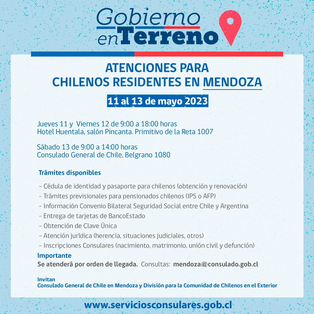 Entre los días 11 y 13 de mayo, se desarrollará un Gobierno en Terreno en la ciudad de Mendoza, cuyo ojetivo es acercar los servicios públicos chilenos a los connacionales residentes.