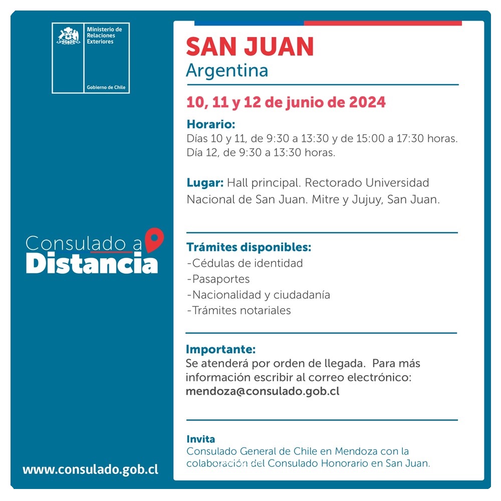 El Consulado de Chile en Mendoza anuncia que realizará, el próximo 10, 11 y 12 de junio del año 2024, un Consulado a Distancia en San Juan.