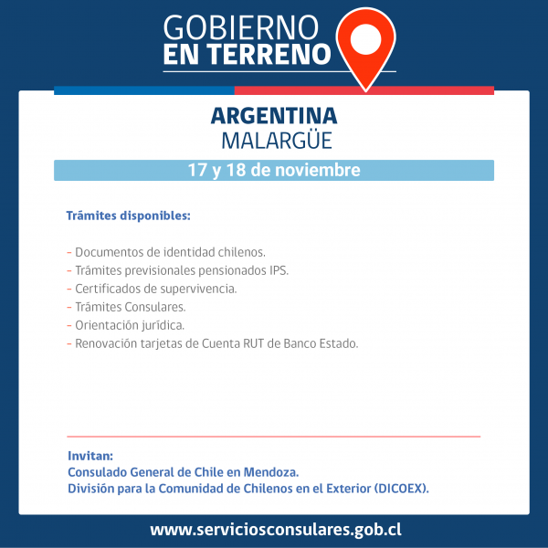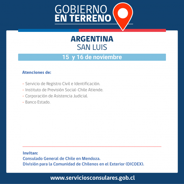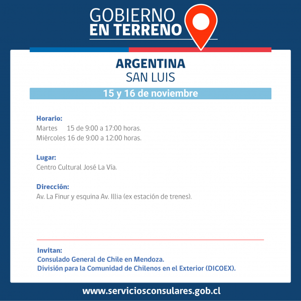 Acercar los servicios públicos a chilenos residentes en las ciudades de San Luis y Malargüe, en Argentina, es el objetivo de la actividad Gobierno en Terreno, organizada por la División para la Comunidad de Chilenos en el Exterior (Dicoex) y el Consulado General de Chile en Mendoza.