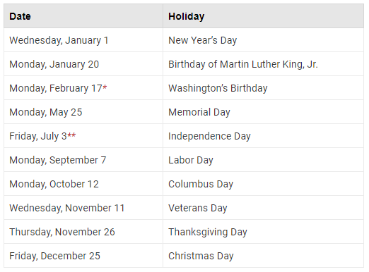 Observed holidays Comparte Síguenos A+ A- CHILEAN HOLIDAYS: May 21st - September 18/19 US FEDERAL HOLIDAYS:
