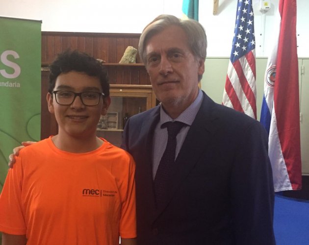 El Cónsul General de Chile en Uruguay, Ministro Consejero Eugenio del Solar, junto a Javier Gallegos, estudiante de IV Medio del Colegio Champagnat de Villa Alemana.