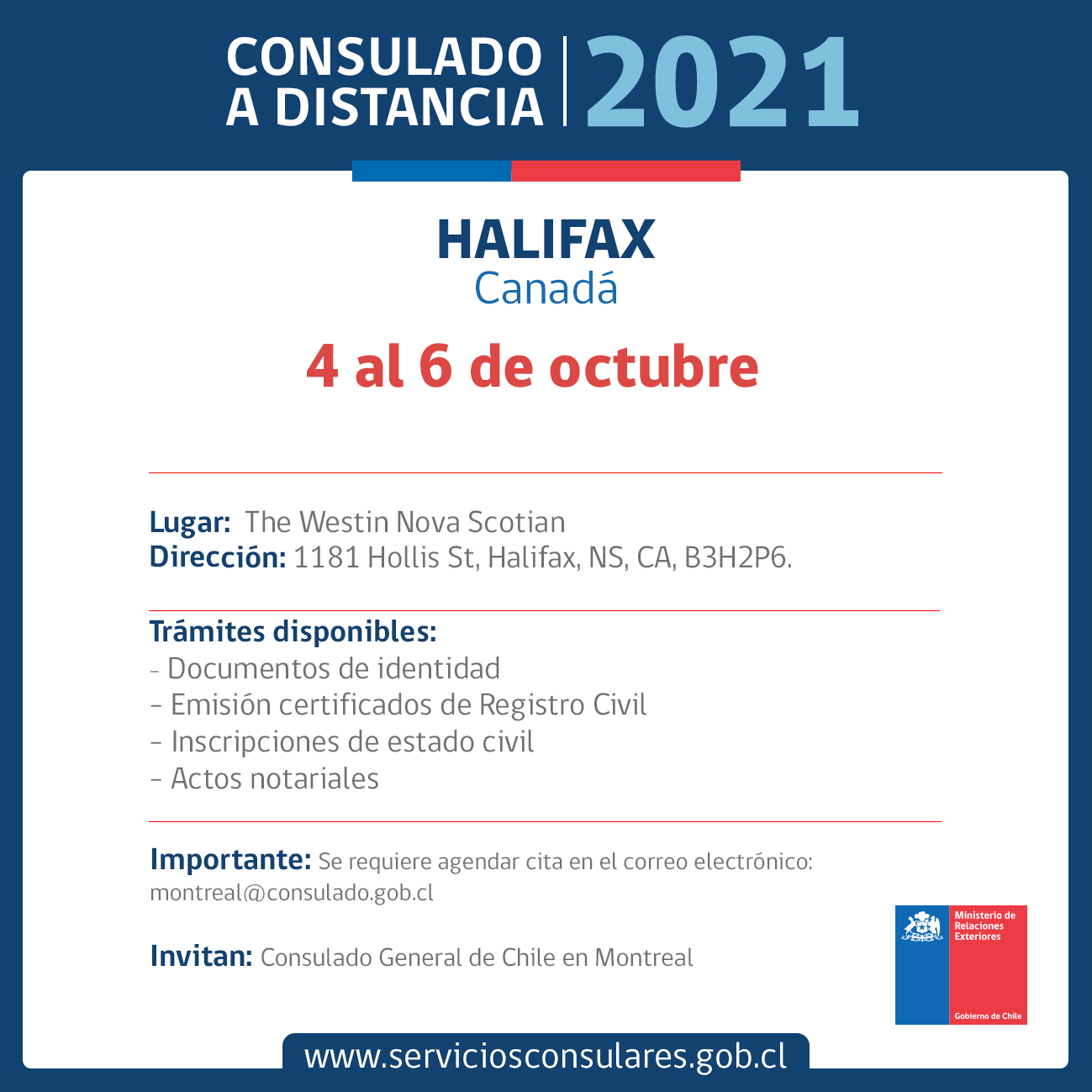 Desde el 4 al 6 de octubre, el Consulado General de Chile en Montreal realizará un consulado a distancia en Halifax, Canadá.