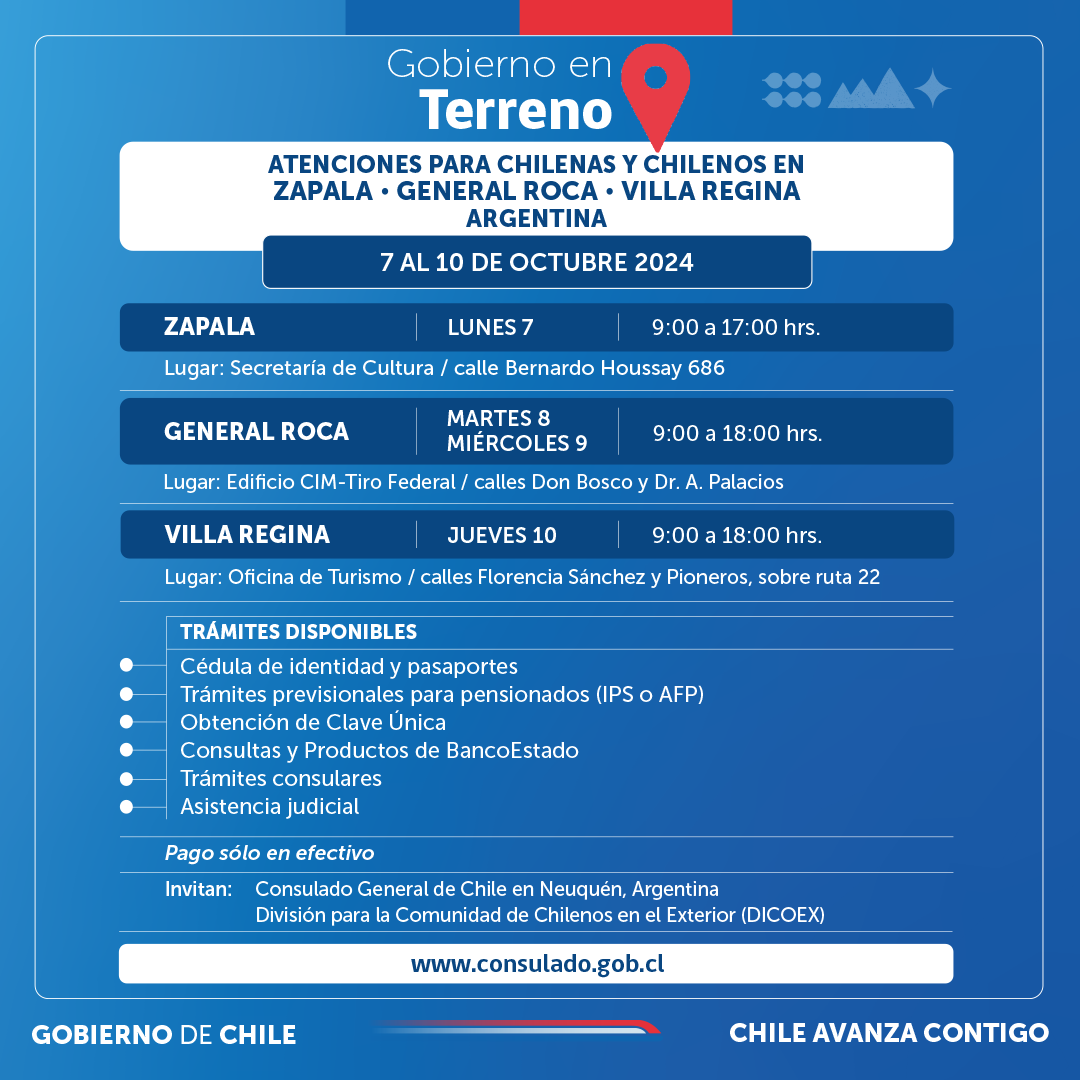 La actividad Gobierno en Terreno, realizada por Dicoex y el Consulado General de Chile en Neuquén, permitirá a connacionales obtener o renovar sus documentos de identidad, realizar trámites previsionales, obtener productos de BancoEstado, hacer inscripciones consulares (nacimiento, matrimonio o defunción) y actos notariales.