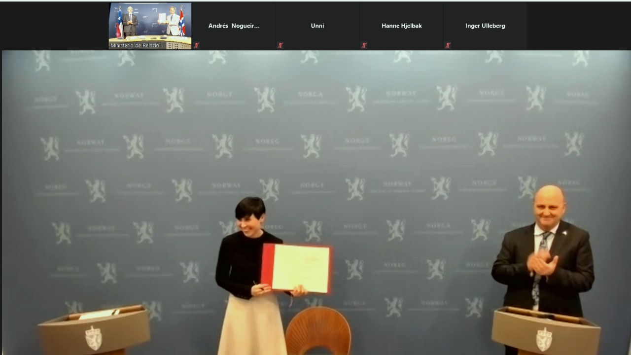 Este lunes, el Canciller Andrés Allamand, y la Ministra de Relaciones Exteriores de Noruega, Ine Eriksen Søreide, firmaron en una ceremonia virtual, un Memorándum de Entendimiento (MoU) para crear un Diálogo Oceánico noruego-chileno. Este, es el primero que Noruega suscribe con un país latinoamericano sobre la materia y permitirá institucionalizar la asociación oceánica estratégica que ambos países han logrado desarrollar en este último tiempo.