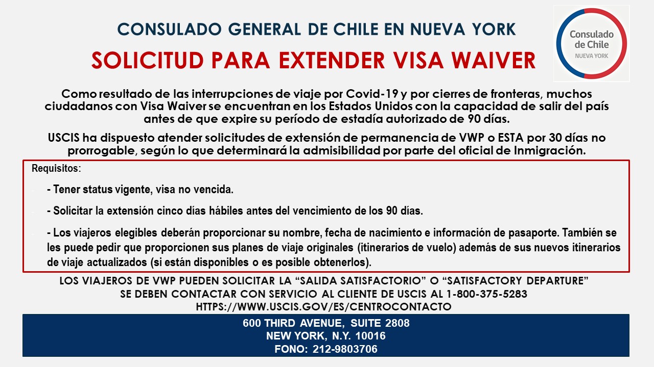 Los chilenos que requieran extender su estadía en Estados Unidos, deben realizar su solicitud al U.S Citizenship and Immigration Services través del siguiente link.