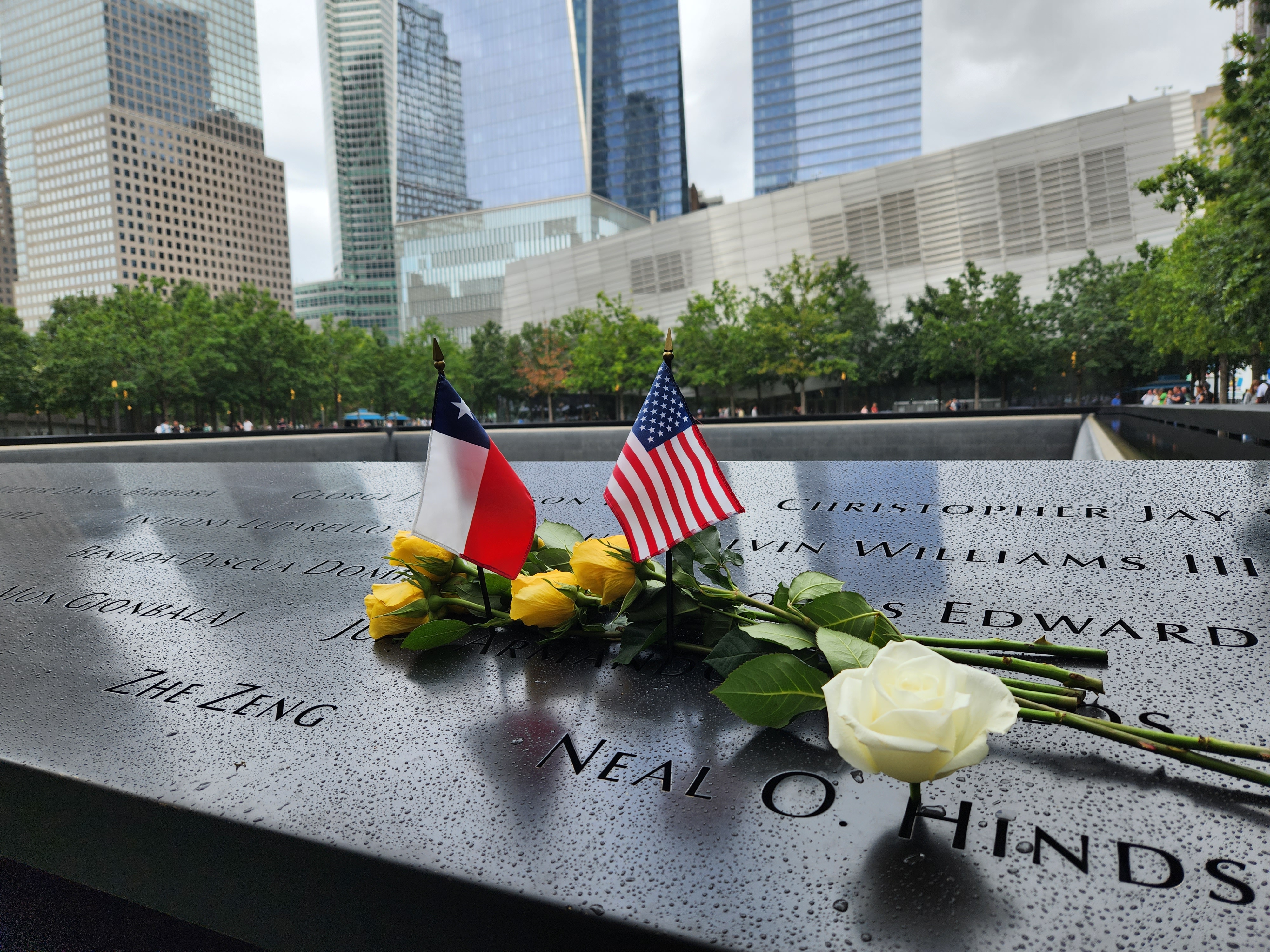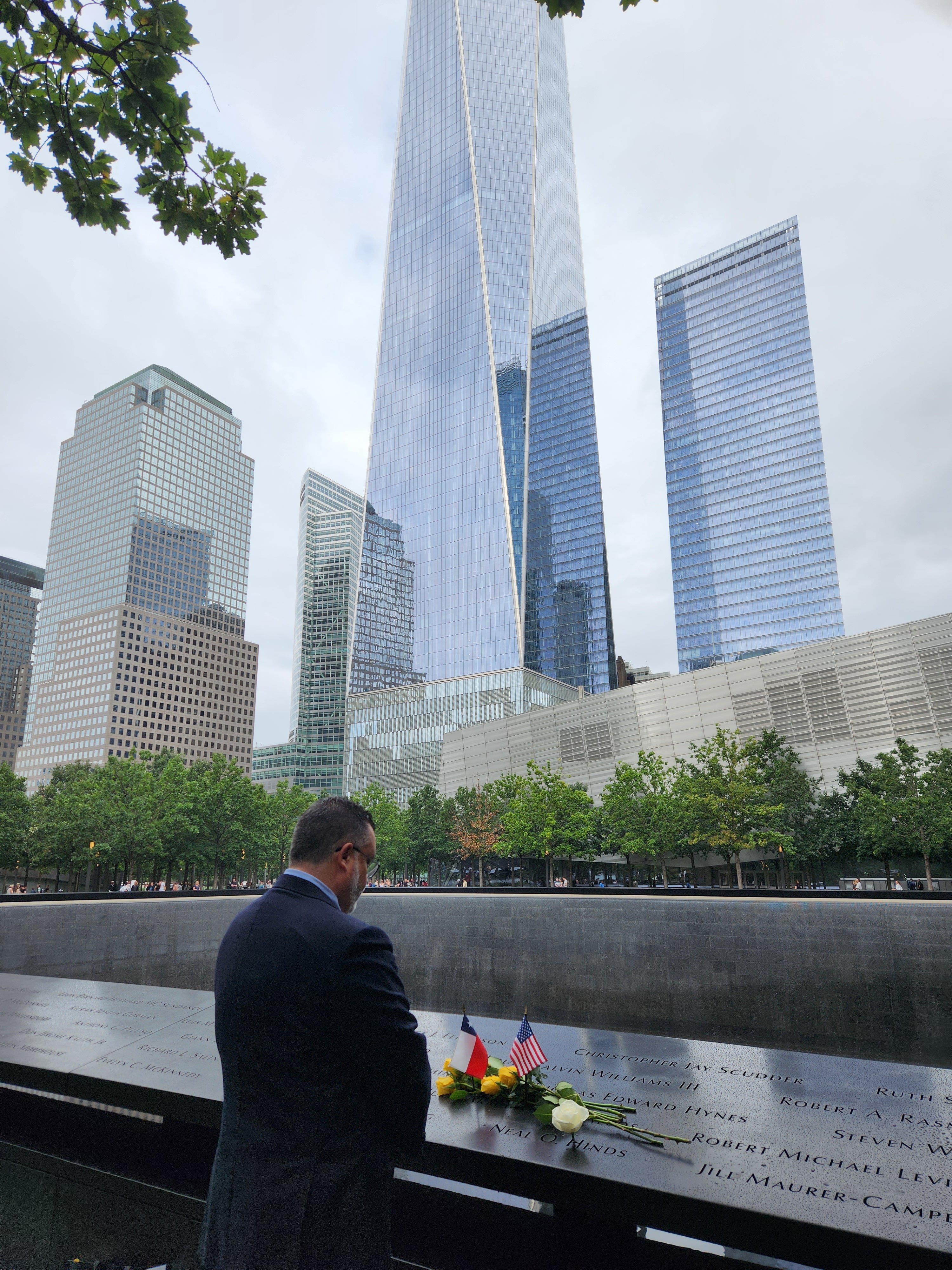 En el lugar del atentado, que le costó la vida a 2.900 personas y fuera perpetrado hace 22 años, actualmente se encuentra un imponente memorial con cascadas de agua y los nombres de los fallecidos inscritos sobre láminas de bronce. En él, el personal del consulado depositó rosas, una bandera chilena y otra estadounidense sobre los nombres de los compatriotas fallecidos ahí, Roy Michael Wallace y Juan Armando Ceballos.