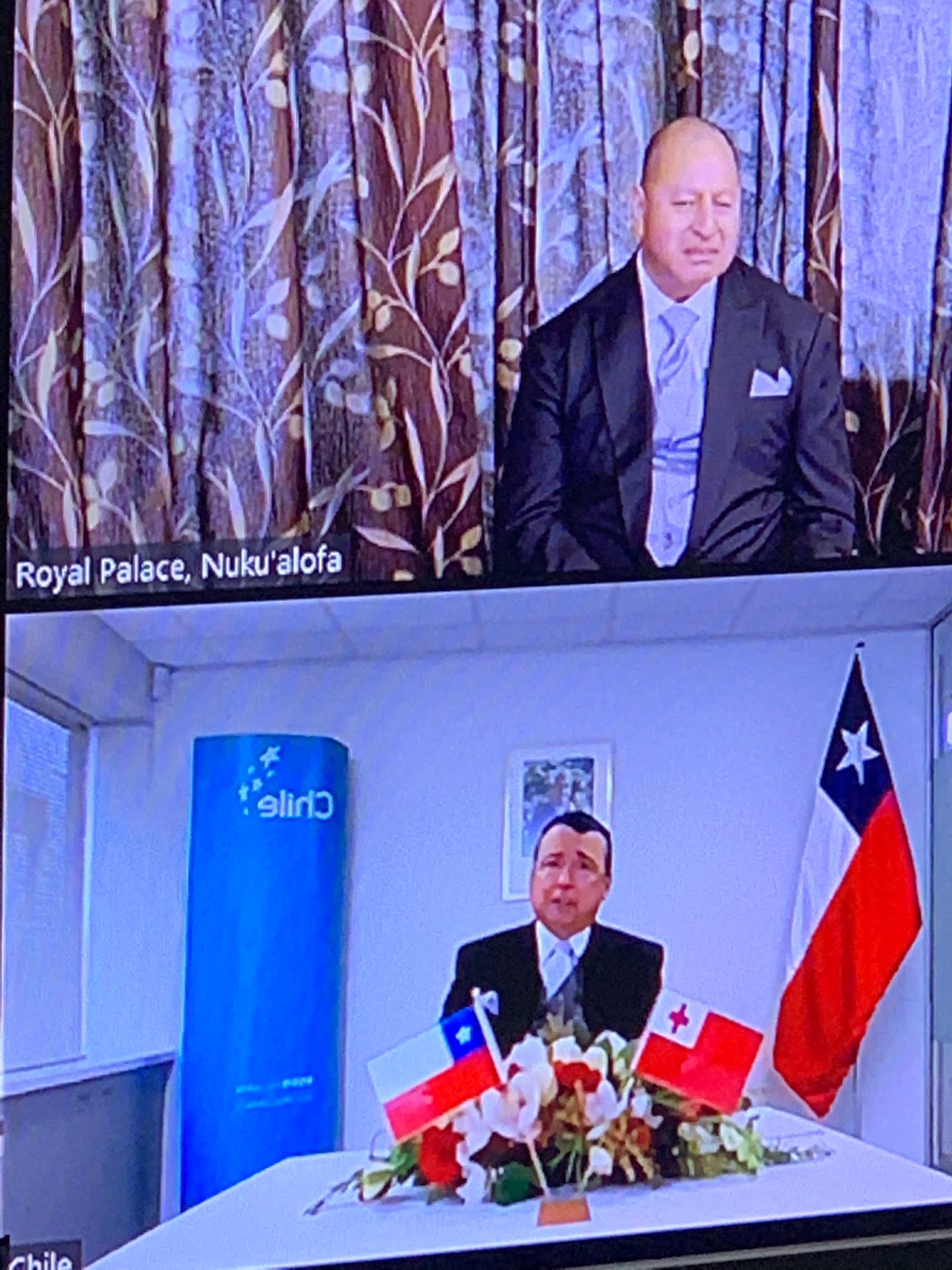 Por su parte, el Rey Tupou consultó sobre la situación en Chile producto de la pandemia Covid-19, felicitando el robusto plan de vacunación de nuestro país. Mencionó la cooperación que existe entre ambos países, en particular en Naciones Unidas, desde donde Tonga concurre a nuestro país, y destacó la importancia de la candidatura de Chile como Socio de Diálogo del Foro de las Islas del Pacífico. Finalmente, el monarca recordó la oportunidad en que la Esmeralda visitó Tonga, en los años 80, ocasión en que su hermano estuvo a bordo del Buque Escuela.