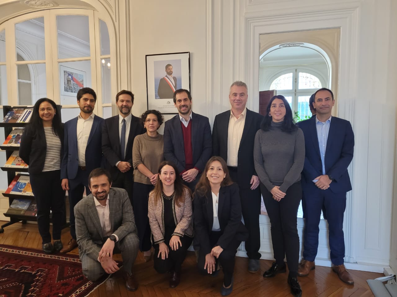 El ministro de Economía, Fomento y Turismo, Nicolás Grau junto a la Directora de InvestChile, Karla Flores y el Jefe de Promoción de Inversiones, Salvatore Di Giovanni participaron de un conversatorio organizado en la Misión de Chile ante la OCDE. El objetivo fue tener una conversación con chilenos y chilenas trabajando en la organización para conocer la agenda de largo plazo, en productividad y cambio climático, del Ministerio.