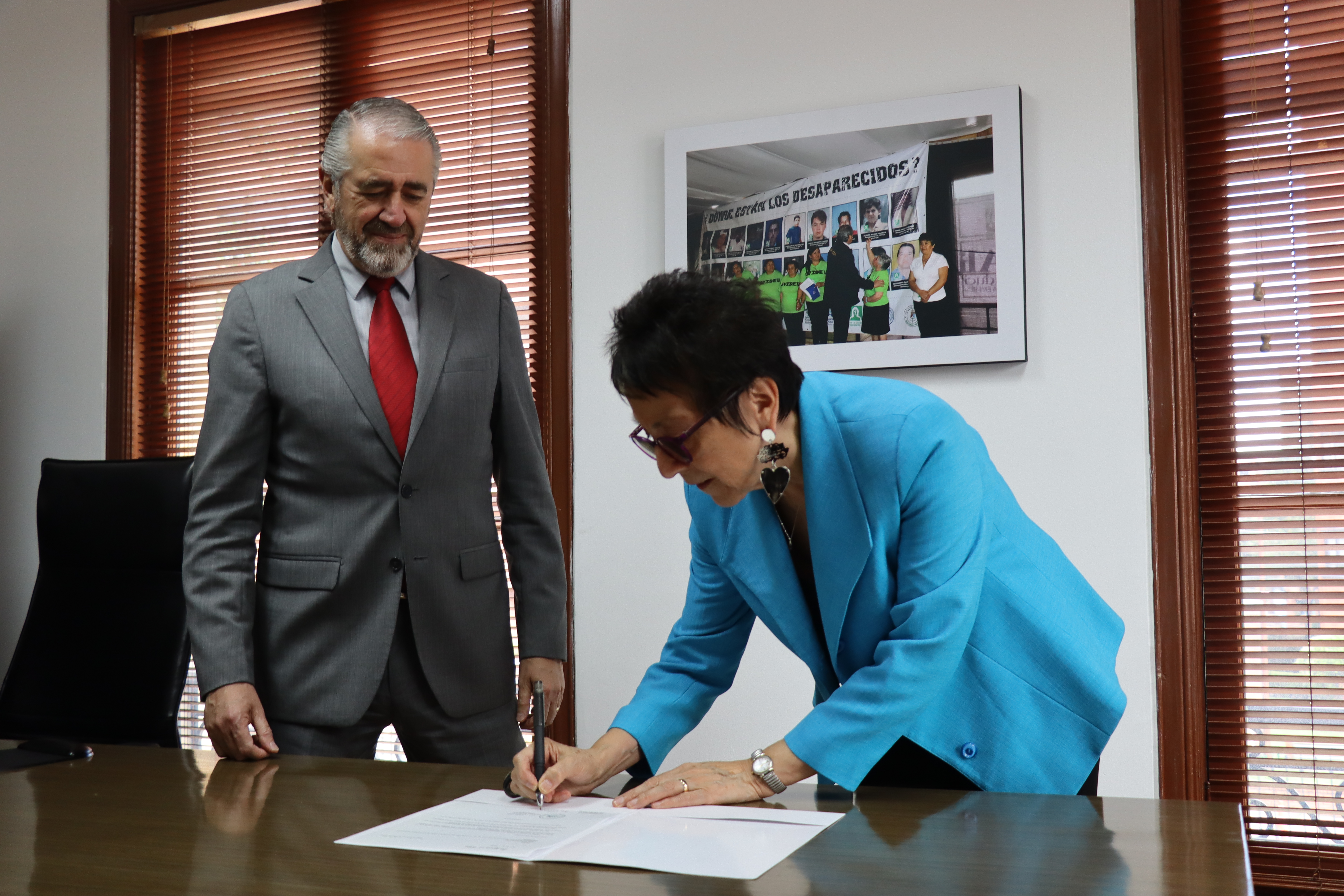 En un encuentro en la sede central de la Misión de Apoyo al Proceso de Paz en Colombia de la Organización de los Estados Americanos (MAPP/OEA), la embajadora de Chile en Colombia, María Inés Ruz Zañartu y el Jefe de la Misión, Roberto Menéndez, firmaron el acta que registra el aporte financiero para la cooperación con la construcción de Paz en Colombia.