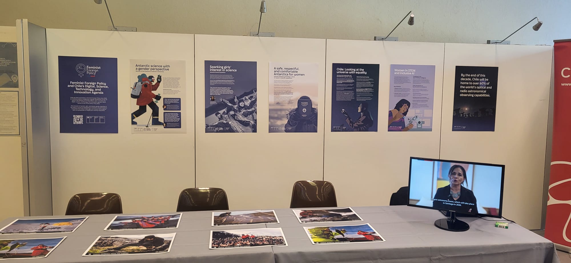Enmarcada en la Política Exterior Feminista, la muestra de Chile relevó iniciativas nacionales relacionadas con la participación de mujeres en ciencias antárticas, astronomía y STEM, ofreciendo también una oportunidad para, en colaboración con otros países y actores interesados, resaltar la equidad de género como elemento destacado del quehacer multilateral.