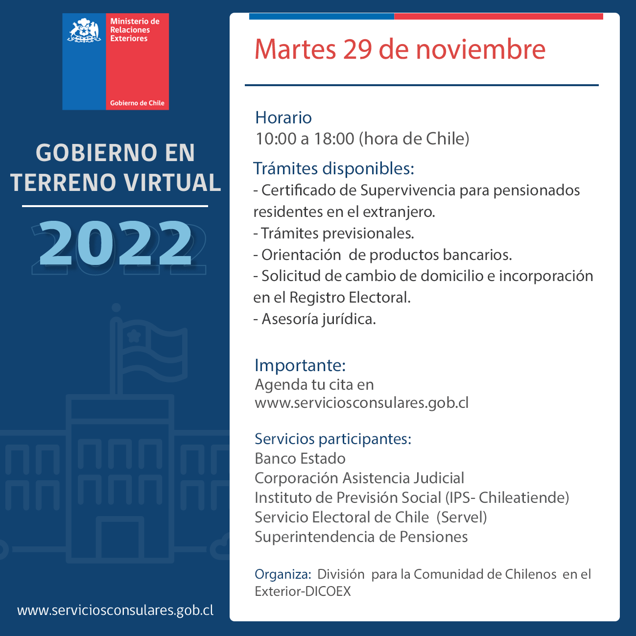 El próximo martes 29 de noviembre, desde 10:00 a 18:00 horas (horario de Chile),se realizará la última jornada de atención "Gobierno en Terreno Virtual".