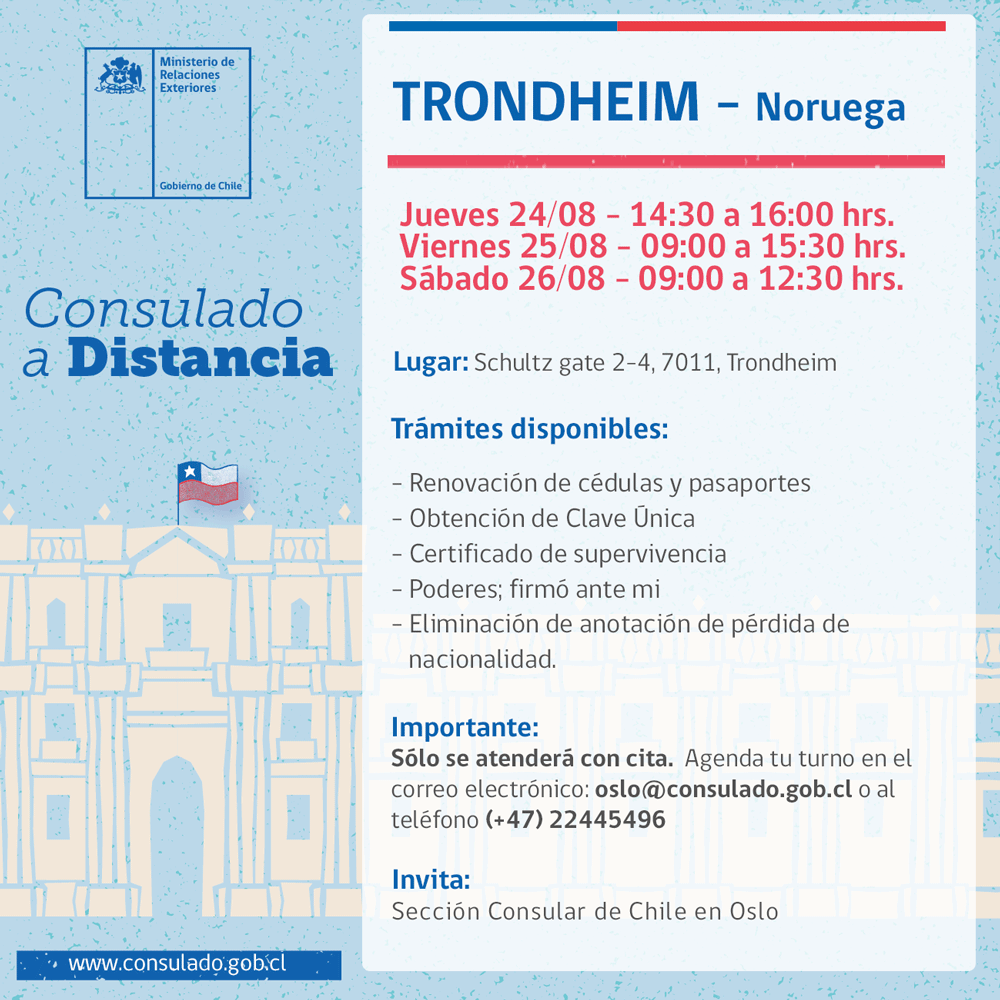 Los días 24, 25 y 26 de julio se realizará el consulado a distancia en la ciudad de Trondheim, Noruega, organizado por la Sección Consular de Chie en Oslo.