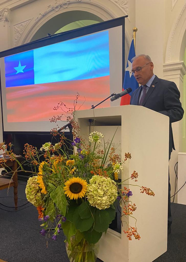 En su discurso, el embajador Jaime Moscoso destacó la estrecha relación y la fructífera agenda bilateral desarrollada entre Chile y Países Bajos durante el último año, como también el dinámico trabajo llevado a cabo en el ámbito multilateral con los Organismos Internacionales acreditados en esta sede. Con motivo de la conmemoración de los 50 años del Golpe de Estado en Chile, se refirió a la solidaridad internacional y agradeció el apoyo brindado por Países Bajos a los miles de chilenos en dicho periodo.