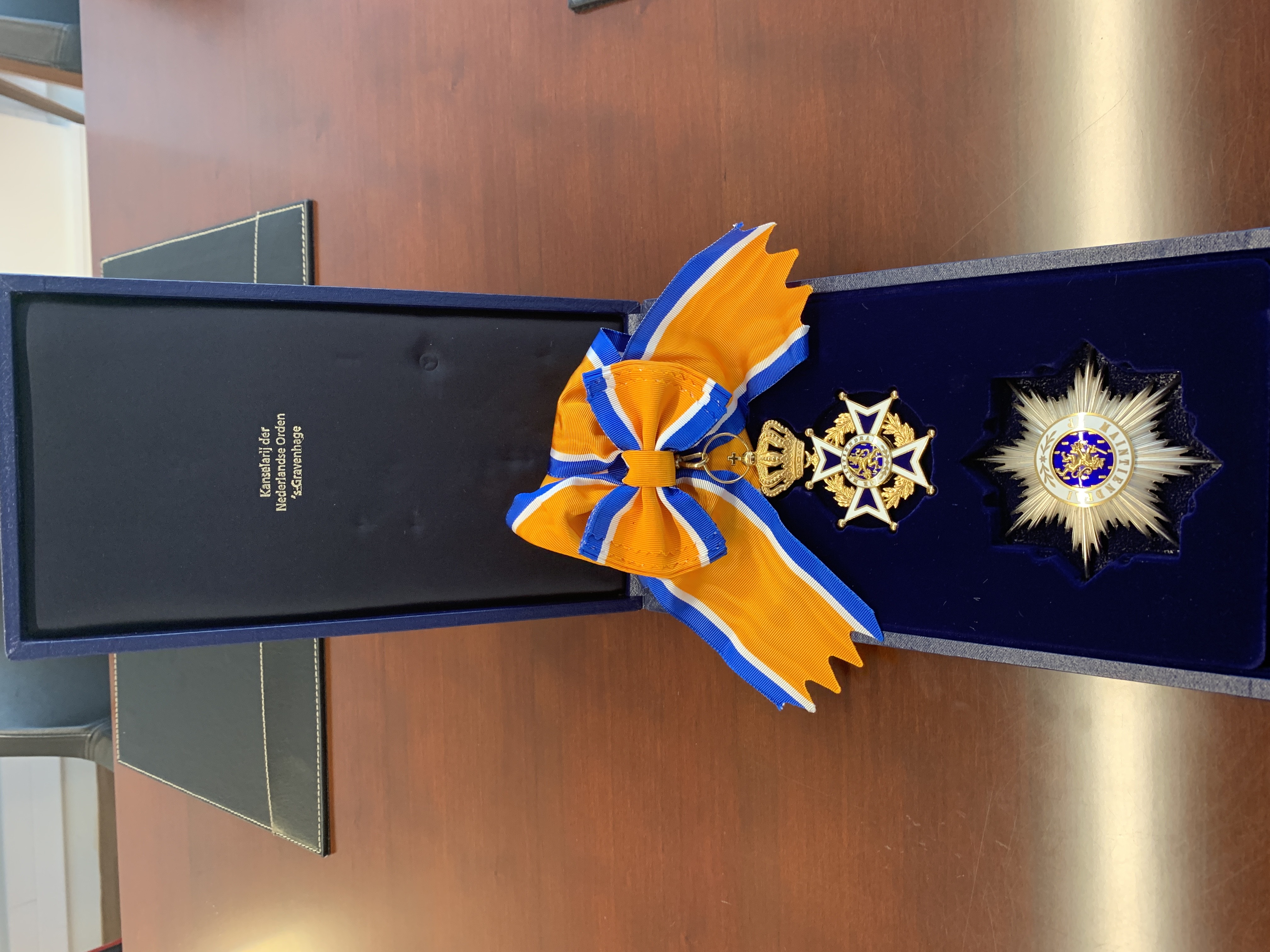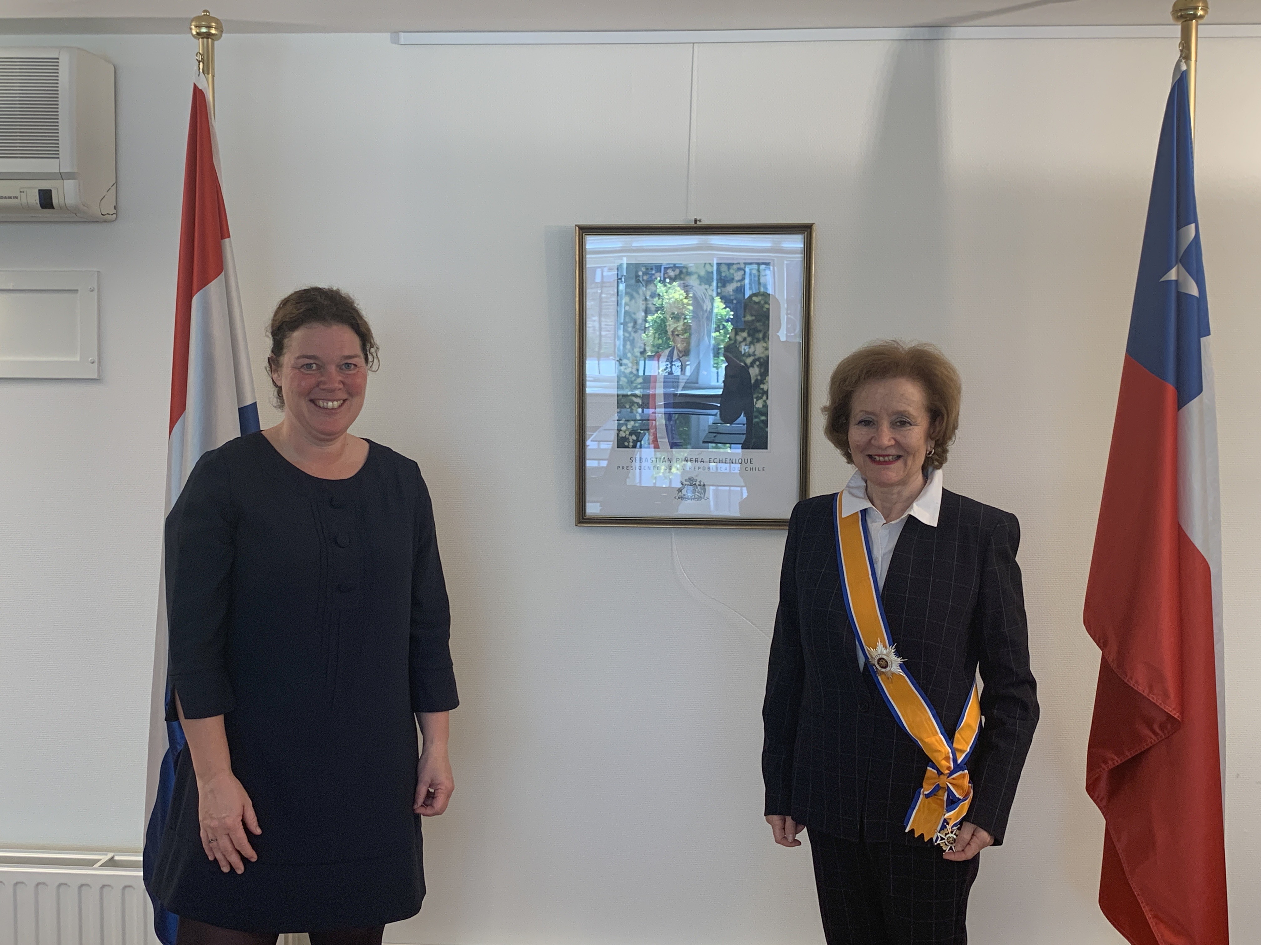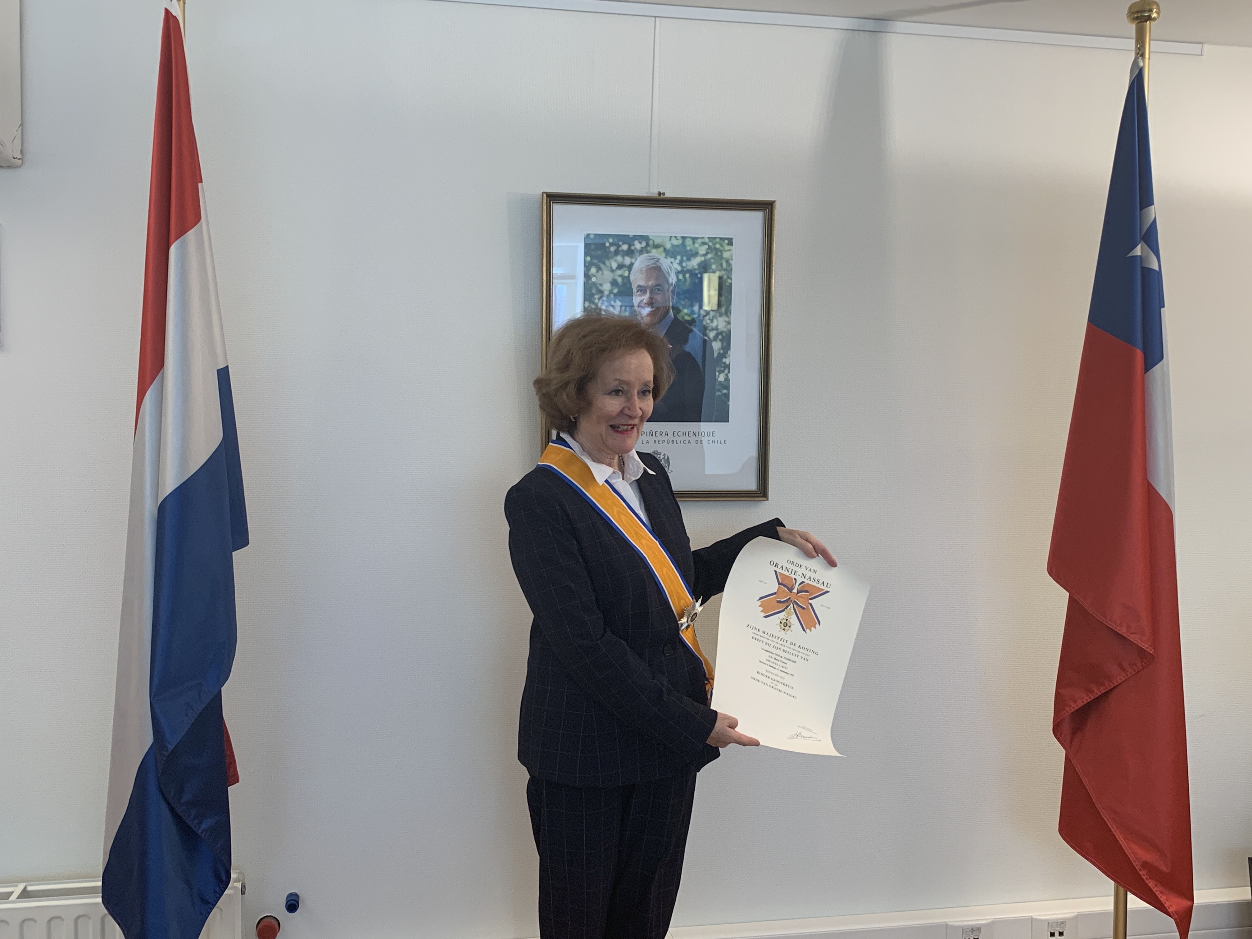 La tarde de este martes 29 de septiembre, en la Embajada de Chile en Paises Bajos, se realizó la ceremonia de condecoración de la Embajadora María Teresa Infante, quien recibió la distinción Caballero Gran Cruz de la Orden Orange-Nassau. Este reconocimiento se le ha entregado luego de estar seis años como Embajadora de nuestro país en La Haya.