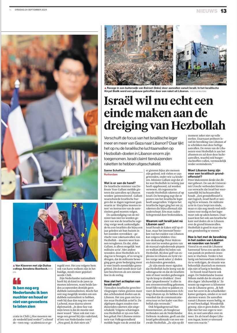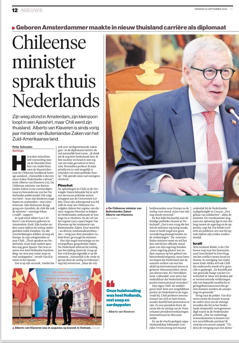 El medio de prensa neerlandés AD publicó el 24 de septiembre una entrevista realizada al Ministro de Relaciones Exteriores de Chile, Alberto Van Klaveren. La entrevista aborda el origen neerlandés del Canciller y algunos aspectos de su vida en Chile. Asimismo, destaca su visión respecto a la situación política actual en los Países Bajos; la guerra en Ucrania; la situación en Venezuela; y el conflicto en Oriente Medio.