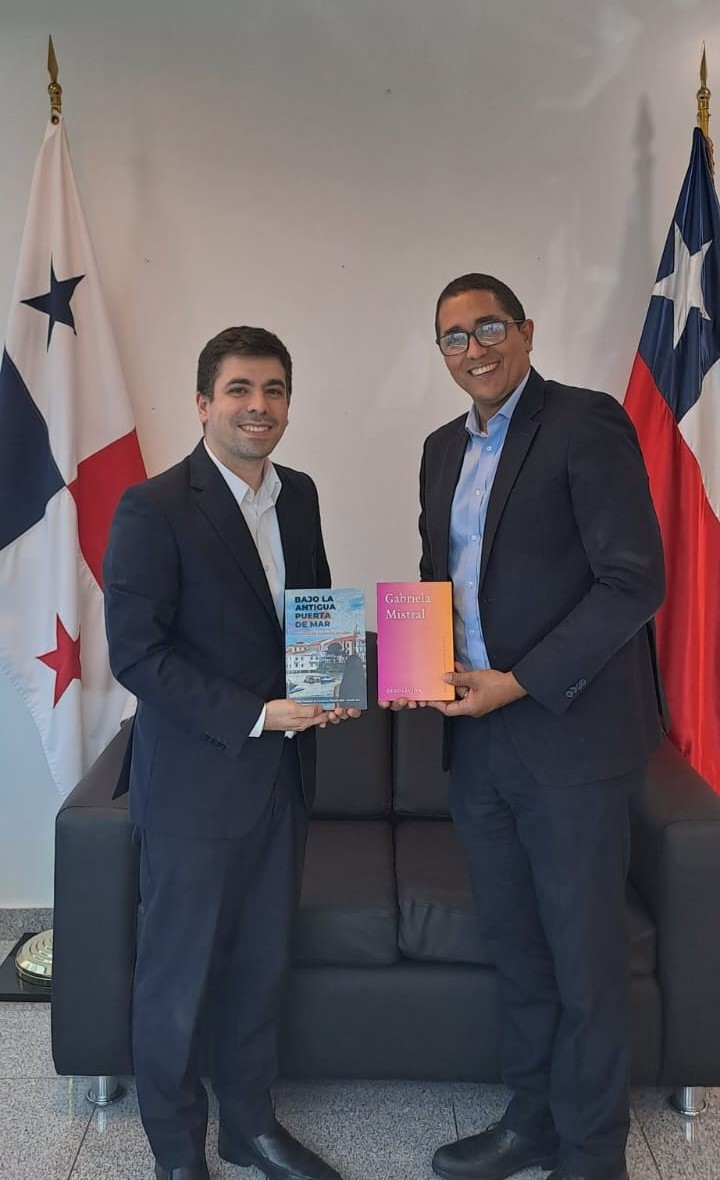 El escritor panameño hizo entrega -como donación a esta Embajada- de una copia de su libro galardonado, "Bajo la antigua puerta de mar", mientras que el Cónsul Pablo Segura le obsequió el libro "Desolación" de la Premio Nobel chilena, Gabriela Mistral.