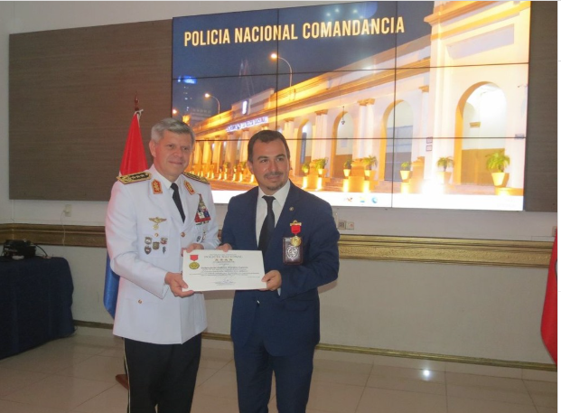 El día martes 21 de enero del presente año, en el Salón de Actos “Crio. Ppal. Póstumo Rufino Acosta Gill” de la Comandancia de la Policía Nacional, se llevó a cabo la Ceremonia de Imposición de “Medalla al Mérito” de la Policía Nacional del Paraguay, al Señor Gabriel Morales Latorre, Subprefecto Policial de la Embajada de Chile en la República del Paraguay, por el término de su misión en el país.