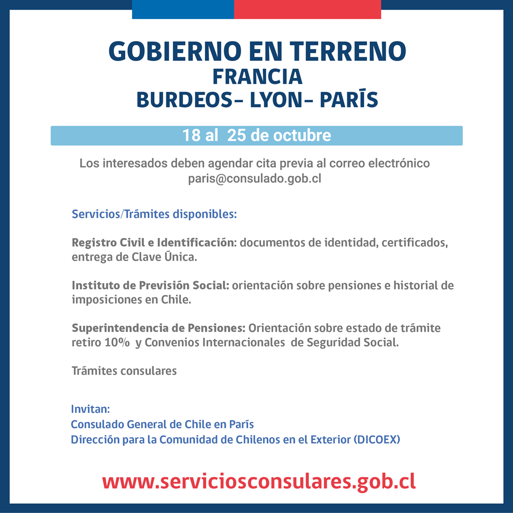Acercar los Servicios Públicos a chilenos residentes en Burdeos, Lyon y París, Francia, es el objetivo de la actividad Gobierno en Terreno, organizada por la Dirección para la Comunidad de Chilenos en el Exterior (Dicoex) del Ministerio de Relaciones Exteriores y el Consulado General de Chile en París.