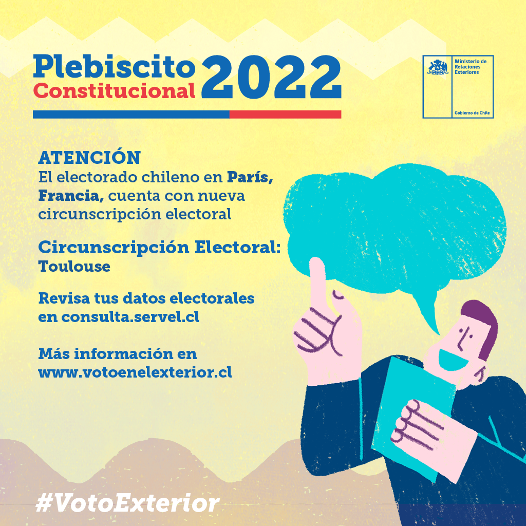 Se informa a los electores chilenos residentes en Francia que se dispuso de una nueva circunscripción electoral en la ciudad de Toulouse, que comenzará a regir desde el Plebiscito Constitucional del domingo 4 de septiembre de 2022.