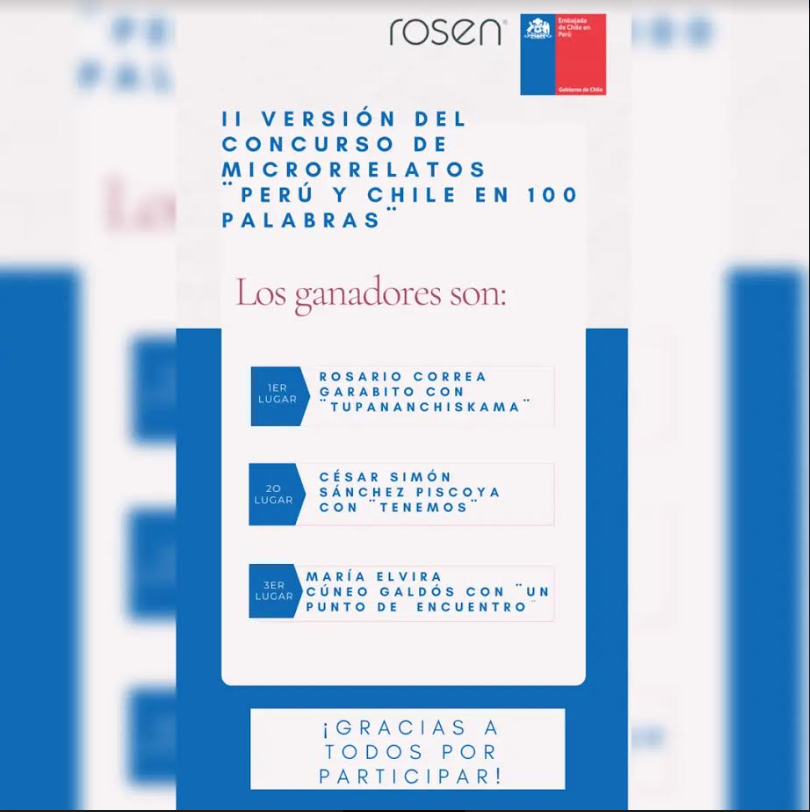 En el marco de la celebración de las Fiestas Patrias de la República de Chile y con el grato recuerdo de los más de 400 microrrelatos recibidos en su versión 2022 "PERÚ - CHILE EN 100 PALABRAS, versión 2022", la Embajada de Chile invita a participar de la 2ª versión del Concurso de Microrrelatos, Perú y Chile en 100 palabras, versión 2023.