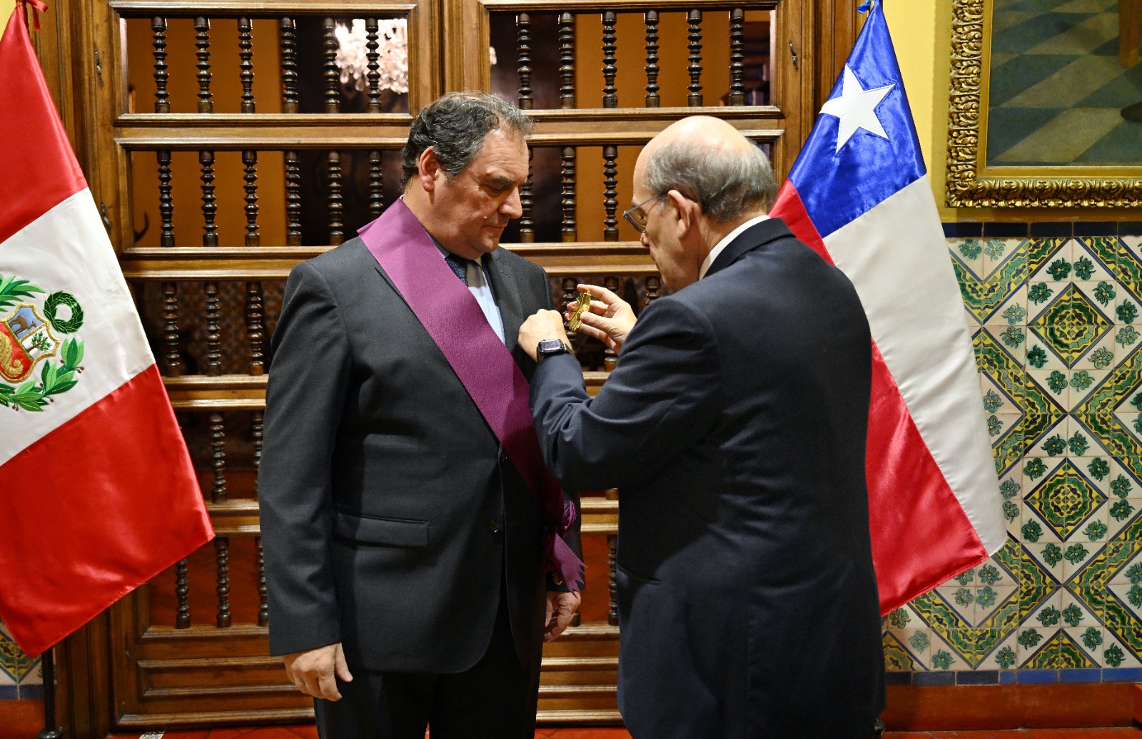 Con motivo del término de su misión diplomática en Lima, el Embajador de Chile, Oscar Fuentes Lira, fue despedido con la máxima distinción que el Estado peruano confiere a ciudadanos extranjeros. En una ceremonia solemne, el diplomático chileno fue condecorado con la Orden “El Sol del Perú” en el grado de Gran Cruz, en reconocimiento a su valiosa contribución al fortalecimiento de las relaciones bilaterales.