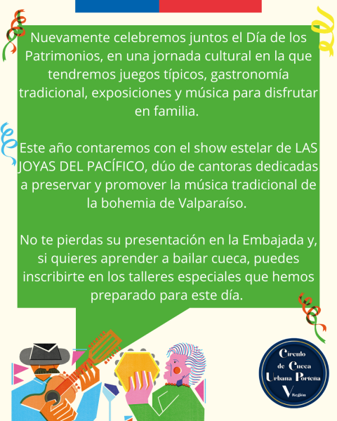 Este año contaremos con el show estelar de LAS JOYAS DEL PACÍFICO, dúo de cantoras dedicadas a preservar y promover la música tradicional de la bohemia de Valparaíso. ¡No te pierdas su presentación en la Embajada!