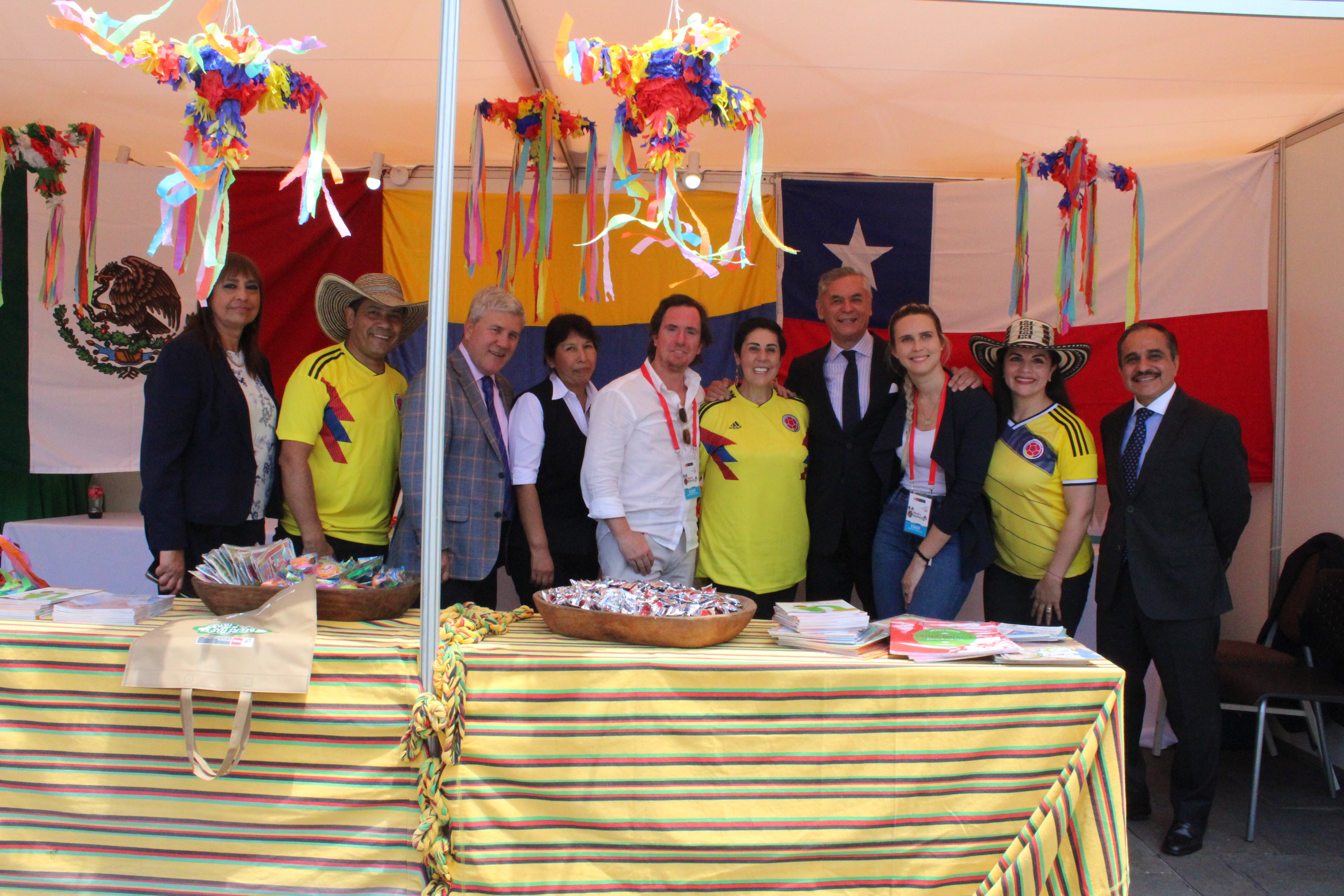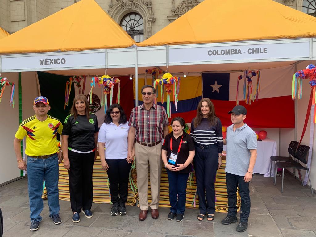 El Embajador hizo un breve recorrido por la feria y, junto con saludar a miembros del cuerpo diplomático y funcionarios de gobierno del Perú, dedicó unos momentos para compartir en el stand preparado en conjunto por las embajadas de Chile, Colombia y México.