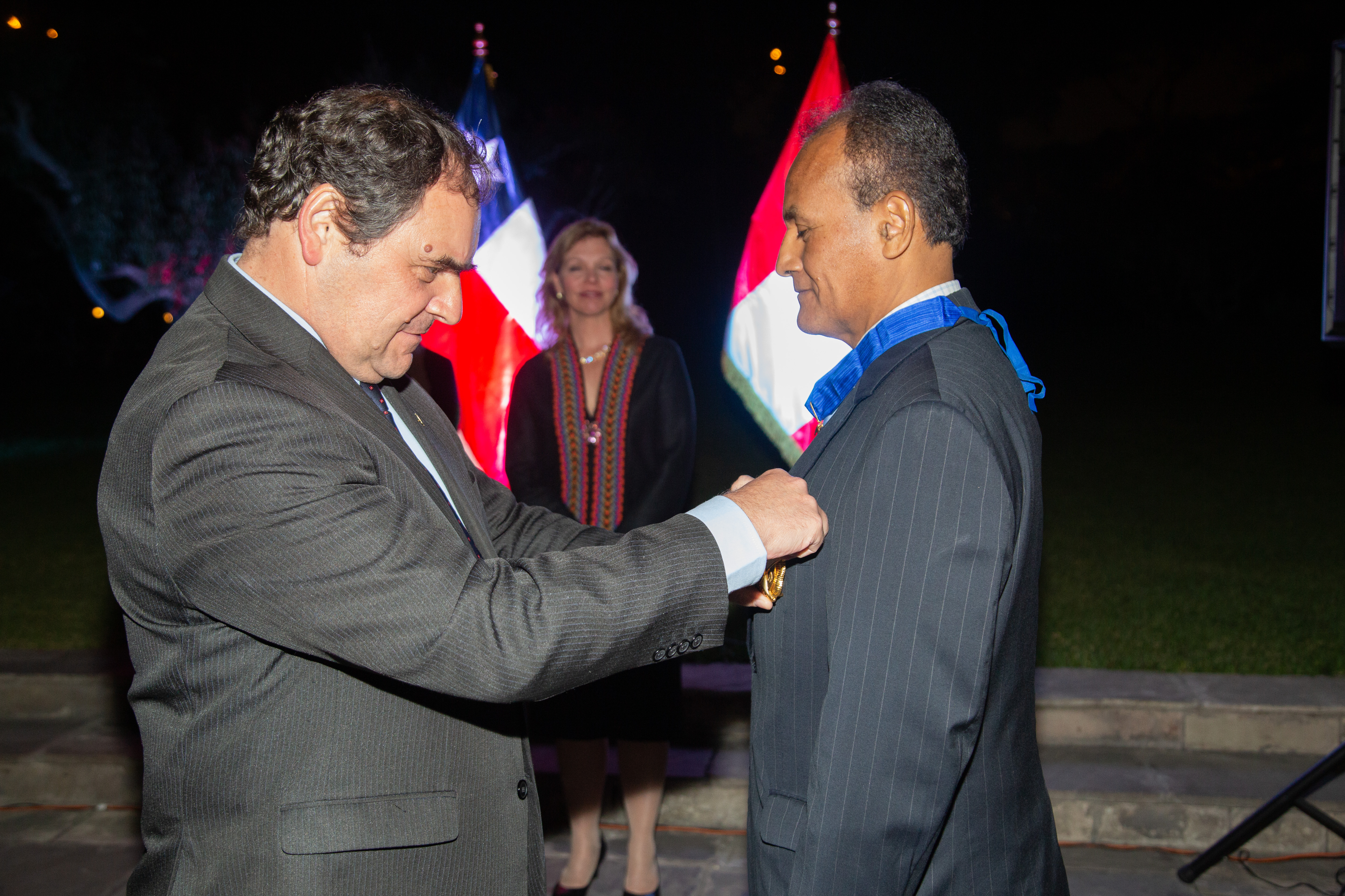 "El Embajador de Chile, Sr. Óscar Fuentes Lira, condecoró al Ministro del Servicio Diplomático de la República del Perú, Renato Reyes Tagle, con la Orden al Mérito de Chile en el grado de Gran Oficial.