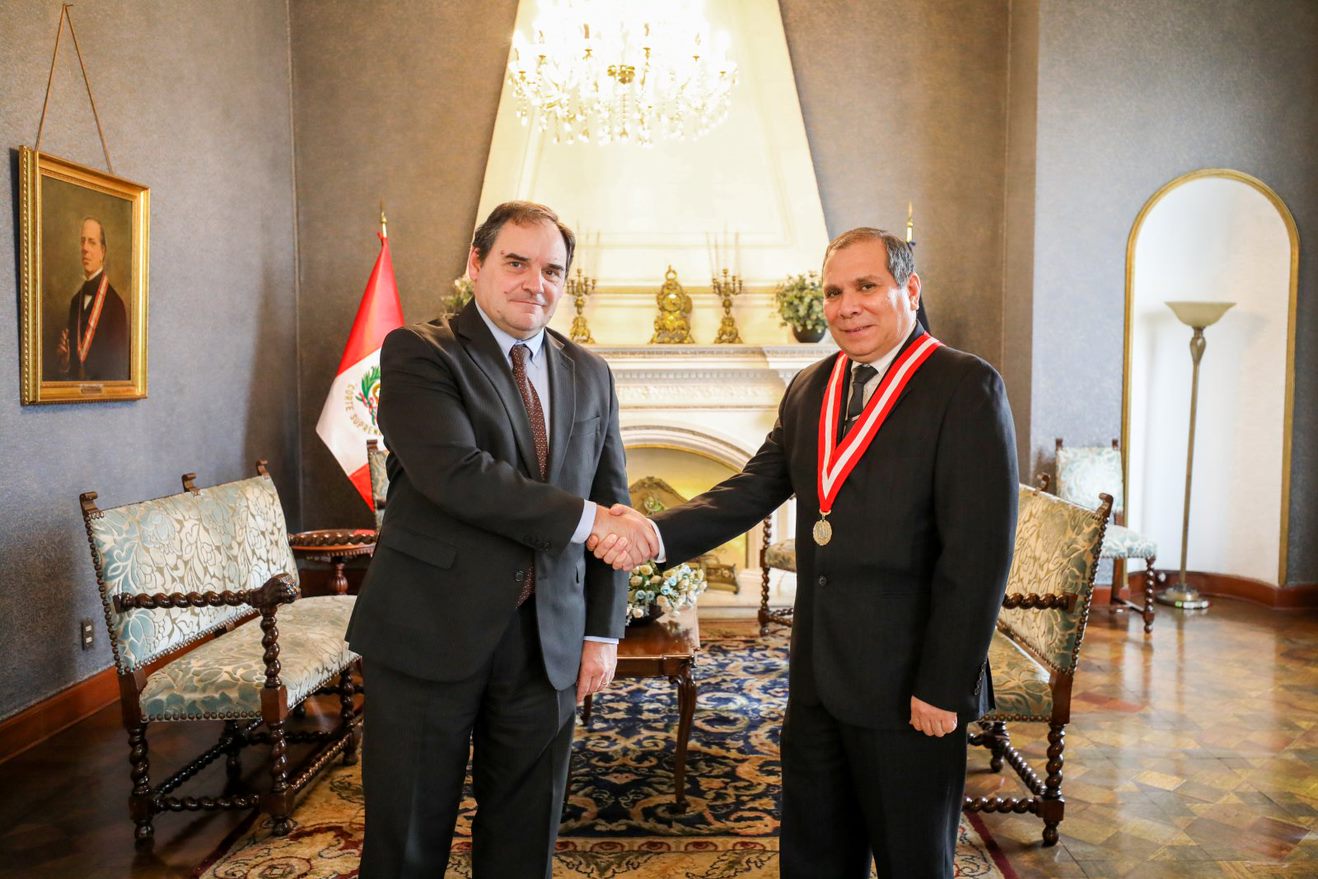 Esta semana, el Embajador Oscar Fuentes Lira mantuvo una fructífera reunión protocolar con el Presidente de la Corte Suprema del Perú,Javier Arévalo Vela. En dicha instancia conversaron sobre los temas de interés y cooperación en común.
