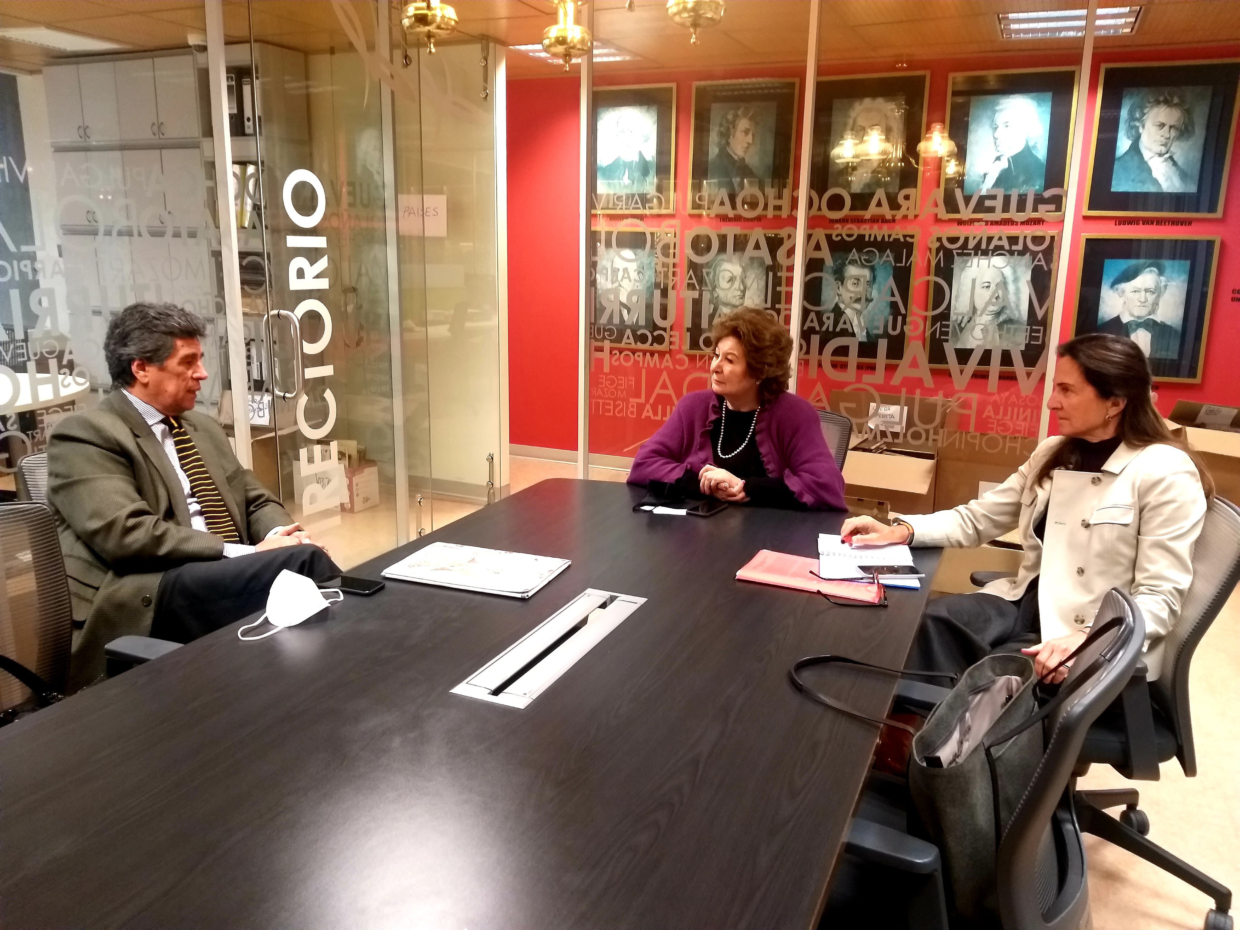 El Embajador Andrés Barbé visitó Radio Filarmonía, donde fue recibido por su Directora Ejecutiva, Pauline Barrón y Grete Arce, Relacionadora Pública de la entidad.