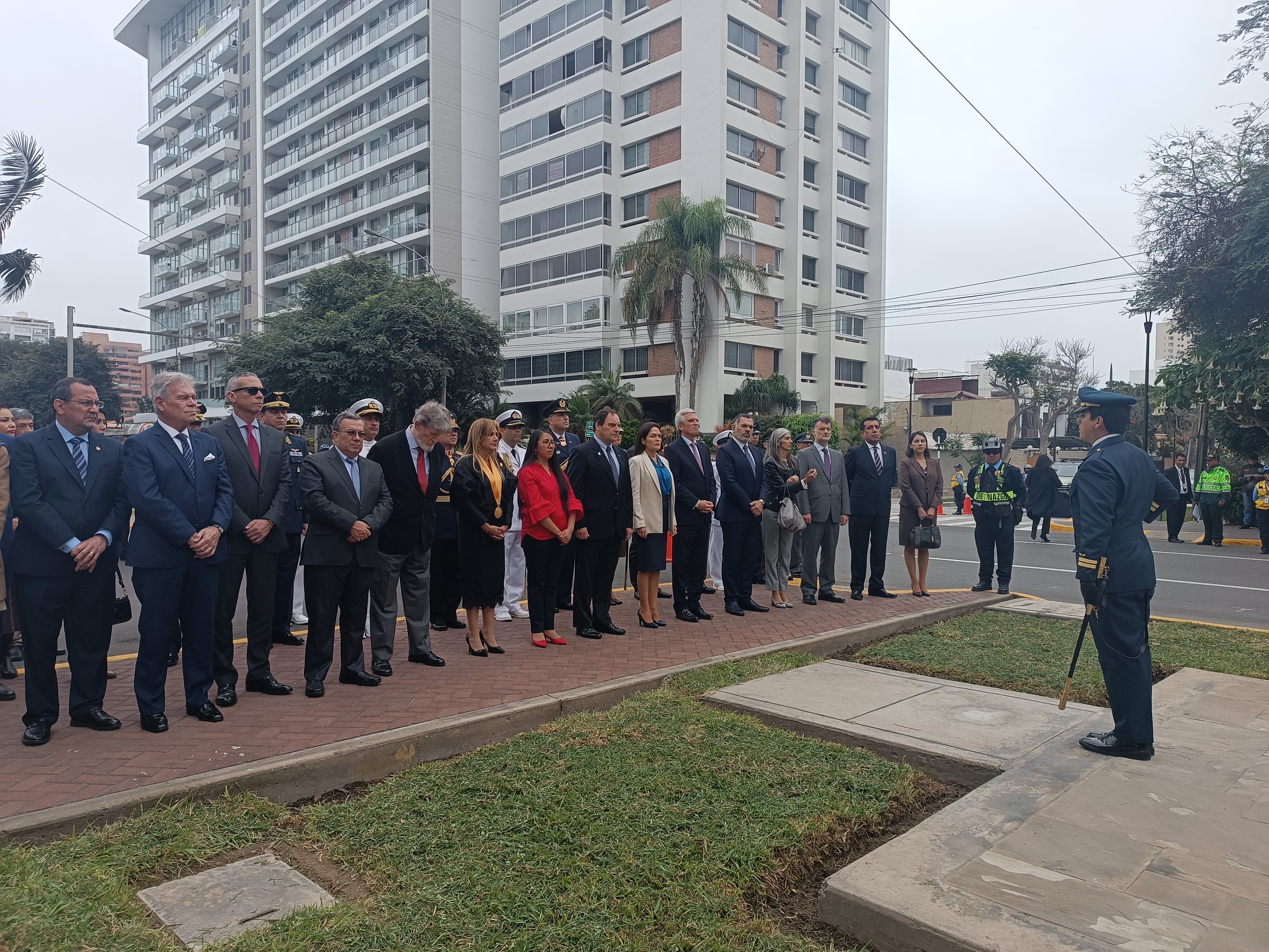 En coordinación con la dirección general de Protocolo y Ceremonial del Estado de la Cancillería local y el municipio de San Isidro, se llevó a cabo una ceremonia de colocación de ofrendas florales el 18 del presente frente al monumento del Capitán General de Chile y Gran Mariscal del Perú, don Bernardo O'Higgins Riquelme.