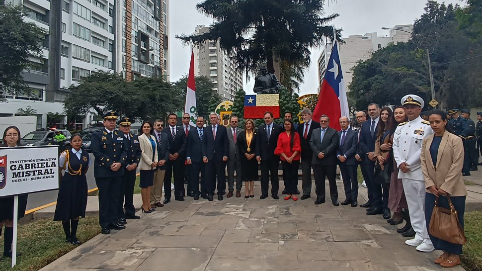 El acto contó con la presencia de la señora congresista Ruth Luque, presidenta de la Liga Parlamentaria de Amistad Perú-Chile; la alcaldesa de San Isidro, Nancy Vizurraga; el director general de América de Torre Tagle, embajador Peter Camino, embajadores, representantes de OOII y diplomáticos de países amigos, oficiales superiores del comando conjunto de las FFAA peruanas y de la Marina de Guerra del Perú, pdte de la Cámara de Comercio Peruano-Chilena, nuestro cónsul honorario en Arequipa, Paúl Díaz; además de un grupo de alumnas del Instituto Educativo "Gabriela Mistral"