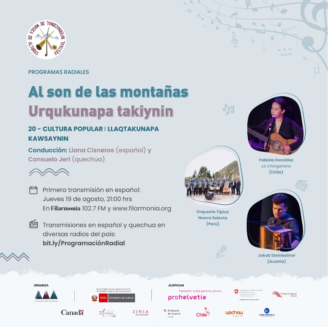 Te invitamos a disfrutar de una nueva emisión del Festival Internacional Música de Alturas. Hoy escucharemos música inspirada en la cultura popular, aquella que se escucha en tabernas y fiestas. Contaremos con la presencia de la cantautora Fabiola González -La Chinganera- de Chile, los saxofones de la Orquesta Típica Nueva Selecta de Perú y el acordeón de Jakob Steinkellner de Austria.