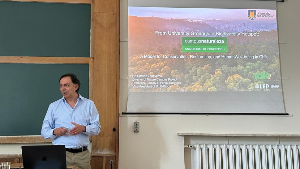 El Dr. Cristian Echeverría Leal impartió la conferencia "From University Grounds to Biodiversity Conservation, Restoration and Human Well-being in Chile", en la que presentó estrategias sobre el impacto del cambio climático en la biodiversidad y el desarrollo sostenible, usando como ejemplo el programa Campus Naturaleza de la Universidad de Concepción.