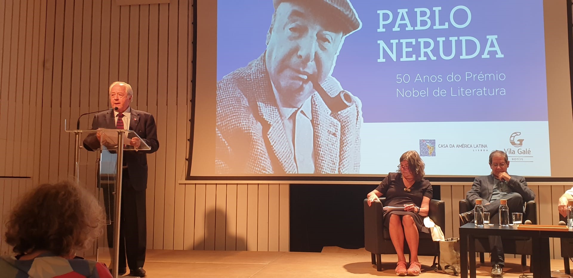 El Embajador Pedro Pablo Díaz participó en evento conmemorativo por los 50 años de la entrega del Premio Nobel a nuestro poeta, Pablo Neruda. El evento fue organizado por Casa América Latina de Lisboa y además, contó con la participación del poeta chileno, Héctor Hernández Montecinos, el editor Carlos Veiga Ferreira y el poeta y traductor Nuno Júdice.