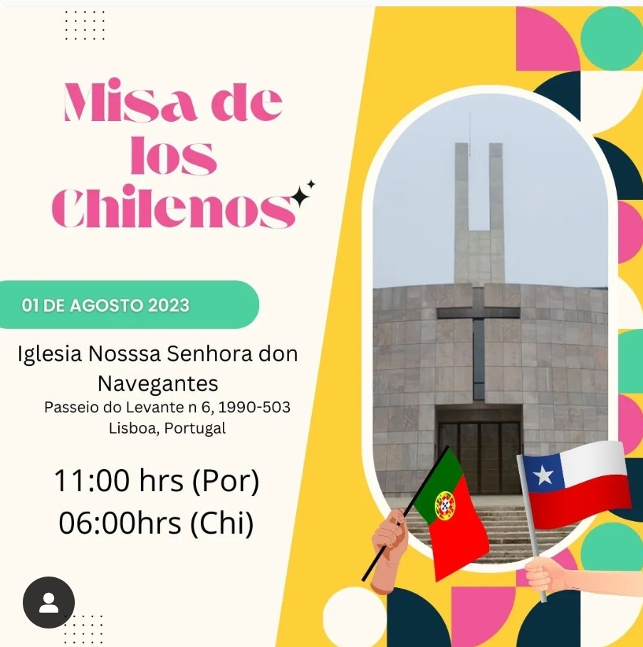 La Conferencia Episcopal de Chle, invita a l@s chilen@s que están participando en la JMJ y a la comunidad chilena residente en Portugal, a asistir a una eucaristía que se efectuará este martes 1º de agosto a las 11:00 hora local, en la Iglesia Nossa Senhora dos Navegantes.